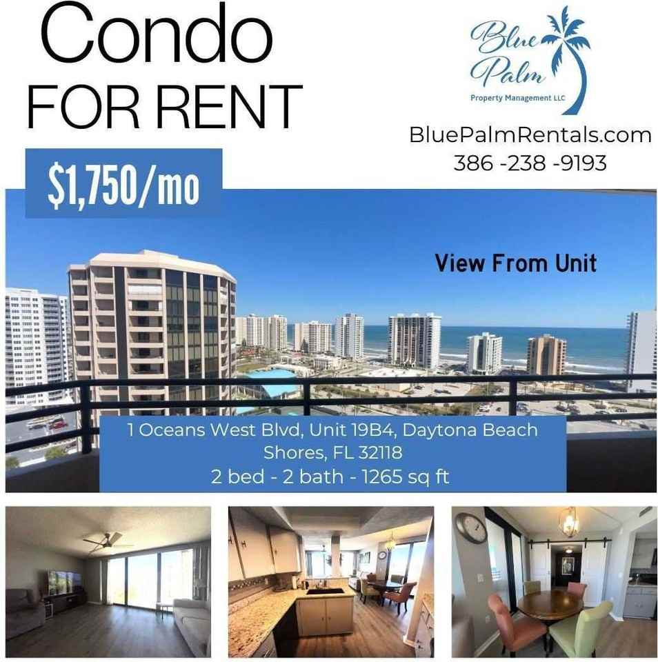 Your new beach life begins here, in the lap of luxury at beautiful Oceans West condos! This spectacular 2 bedroom 2 bath condo offers direct ocean view and beautiful intracoastal river views and 1265 sq ft of space. TWO private balconies. This unit is fully furnished, just move in and start enjoying the beach life and beautiful ocean views from every room. Wonderful flowing floorplan, large living area with ceiling-to-floor windows and a spacious kitchen with gorgeous granite counters. Oceans West offers a beautiful pool area, water/cable/internet are included in the rent. This building features 12 pickle ball courts & 6 Tennis courts available to be used by tenant at no additional cost, and a 13 hole golf course available with small fee. Fantastic location just north of Dunlawton Ave in Daytona Beach Shores near some of the area's best shopping (walking distance to the Shores Publix & Walgreens), restaurants, golfing, and entertainment hot spots! Your search for the beach dream ends right here! Annual Lease. Annual lease. No Smoking/No Pets. 1 month's rent & security deposit equal to 1 months rent required to move in. Background/credit check required. All Blue Palm Property Management residents are enrolled in the Resident Benefits Package (RBP) for $50.00/month which includes liability insurance, credit building to help boost the resident’s credit score with timely rent payments, up to $1M Identity Theft Protection, HVAC air filter delivery (for applicable properties), move-in concierge service making utility connection and home service setup a breeze during your move-in, our best-in-class resident rewards program, on-demand pest control, and much more! More details upon application.