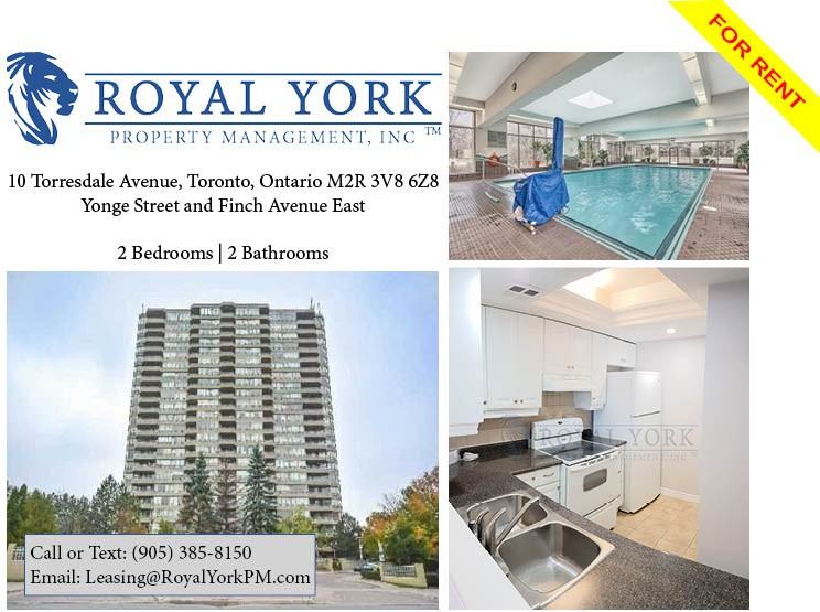 2 BED/2 BATH,Walk-in Closet,Two Parking Spots,9 Ft Ceiling,Upgraded Bath,Backsplash,Hardwood Flrs,Tons of Natural Light,Washer/Dryer In Unit,Central HVAC,Large Balcony,Bathurst St,Finch Ave West,Northivew Heights Secondary School,North York Civic Soccer Fields,Esther Shiner Stadium,North York,Toronto,Willowdale,Close to Public Transit,TTC,Finch Stn,YRT/Viva Bus Terminal,Go Stn,Hwy 401,DVP,Toronto Public Library,North York Passport Canada Office,St. John's Rehab at Sunnybrook,Don Valley Golf Course,Bayview Village Shopping Centre,North York General Hospital,Willowdale Animal Hospital,Schools,Parks,Supermarkets,Shops,Restaurants,Steakhouses,Bars,Night Clubs,Major Banks,Fitness Centre,Discounted Cable,Phone and Internet. Call or Text: (905) 385-8150 Email: **** 10 Torresdale Avenue, Toronto, Ontario M2R 3V8 Yonge Street and Finch Avenue East $2,095 (Two Parking Spots and Locker Available) Discounted Cable, Phone & Internet (Throughout The Term) Large Living Space & Balcony!! Separate Area For Dining Room!! Unit Amenities: - 2 Bedrooms | 2 Bathrooms - Walk-in Closet - 9 foot Ceilings - Hardwood floors throughout - Upgraded Bathrooms - En-suite Laundry - Great Area Views - Tons of Natural Light - Visitor Parking Available Two Parking Spots and Locker Available Bathurst St, Finch Ave West, Northivew Heights Secondary School, North York Civic Soccer Fields, Esther Shiner Stadium, North York, Toronto, Willowdale, Close to Public Transit, TTC, Finch Station,YRT/Viva Bus Terminal, North York Centre Station, Go Station, Hwy 401, DVP, Toronto Public Library, North York Passport Canada Office, St. John's Rehab at Sunnybrook, Don Valley Golf Course, Bayview Village Shopping Centre, North York General Hospital, Willowdale Animal Hospital, Schools, Parks, Supermarkets, Shops, Restaurants, Steakhouses, Bars, Night Clubs, Major Banks, Fitness Centre, Discounted Cable, Phone and Internet. Building Amenities: - Swimming Pool - Sauna - Lounge - Party Room - Yoga / Pilates Room - Fitness Centre - Spin Room - Guest Suits - 24/7 Security and Concierge Service Available Immediately!! **CALL OR TEXT (905) 385-8150
