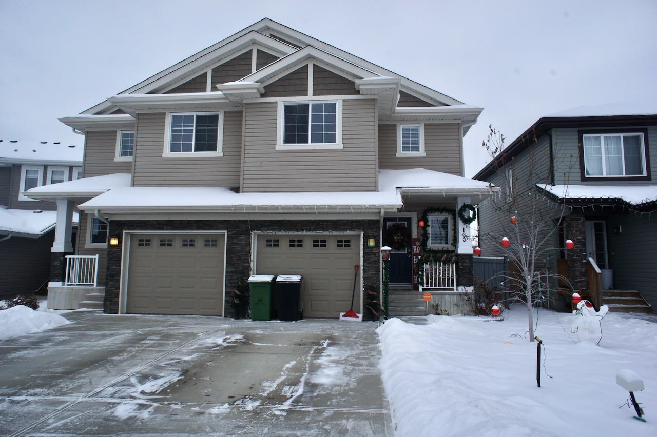 Welcome Home! Perfect 3 bedroom 2.5 Bath Duplex in Great Fort Saskatchewan Location. Backs onto greenspace walking trails. Single attached garage. Quiet private ring road area close to schools, shopping, and highway. Main floor has wonderful kitchen and open concept and walk in pantry. Appliances Included. Dining area leads to back yard deck, dog run, landscaped back yard, and back gate to green space and walking trails. Main floor half bathroom and great entrance way. Unfinished basement. Top floor has open hallway space, full bathroom and 3 bedrooms. Master bedroom is fantastic with huge ensuite with large soaker tub and stand up shower. This is a must see place and above average. Courtesy Realty Executives Focus.