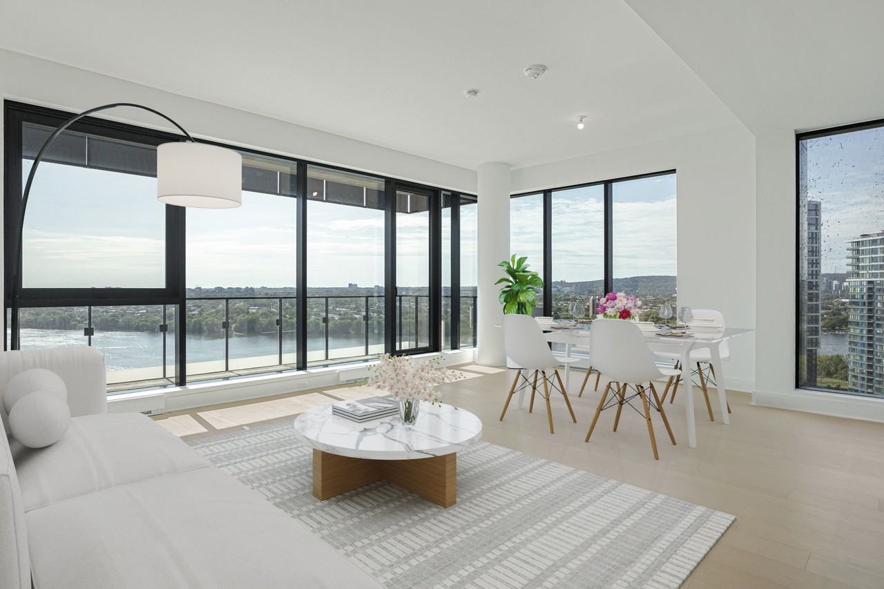 Symphonia VIU - Elegant corner unit featuring upscale finishes and timeless sophistication. Offering 1,465 sq. ft. (gross) as well as 126 sq. ft., airy spaces 10-foot ceilings and full-height windows, and a terrace with breathtaking views of the river, downtown skyline, and golf course. This beautiful condo offers comfort and style and features an open layout, 2 bedrooms, and 2 bathrooms. - Large private balcony - Indoor parking, and locker - Central air conditioning - Air exchanger for fresh air - Sleek kitchen cabinets - Quartz countertop and backsplash - Miele appliances