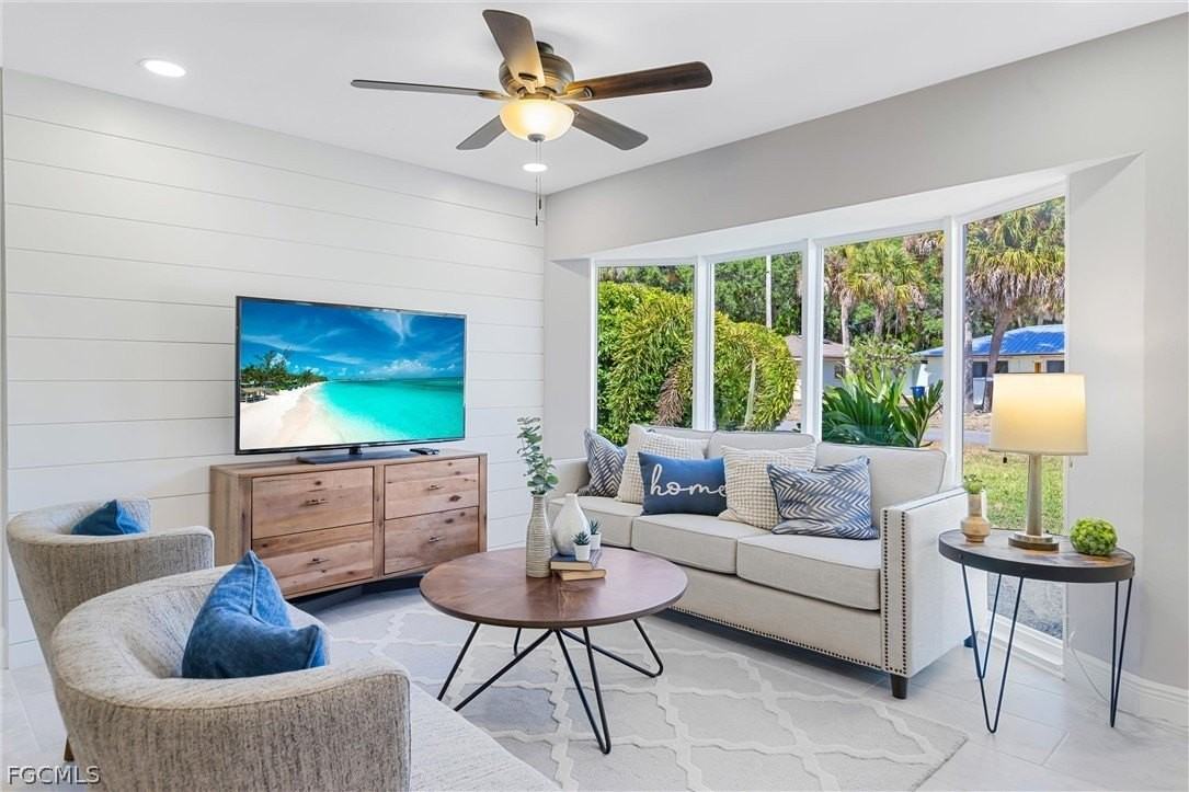 With an appealing interior featuring white cabinetry, stainless steel appliances, and quartzite countertops, the home presents a modern aesthetic. The abundance of 31 photos allows potential renters to visually appreciate its charm and updates, including custom tray ceilings and updated windows. Ideal for those looking for contemporary finishes, this property stands out in the North Fort Myers area.