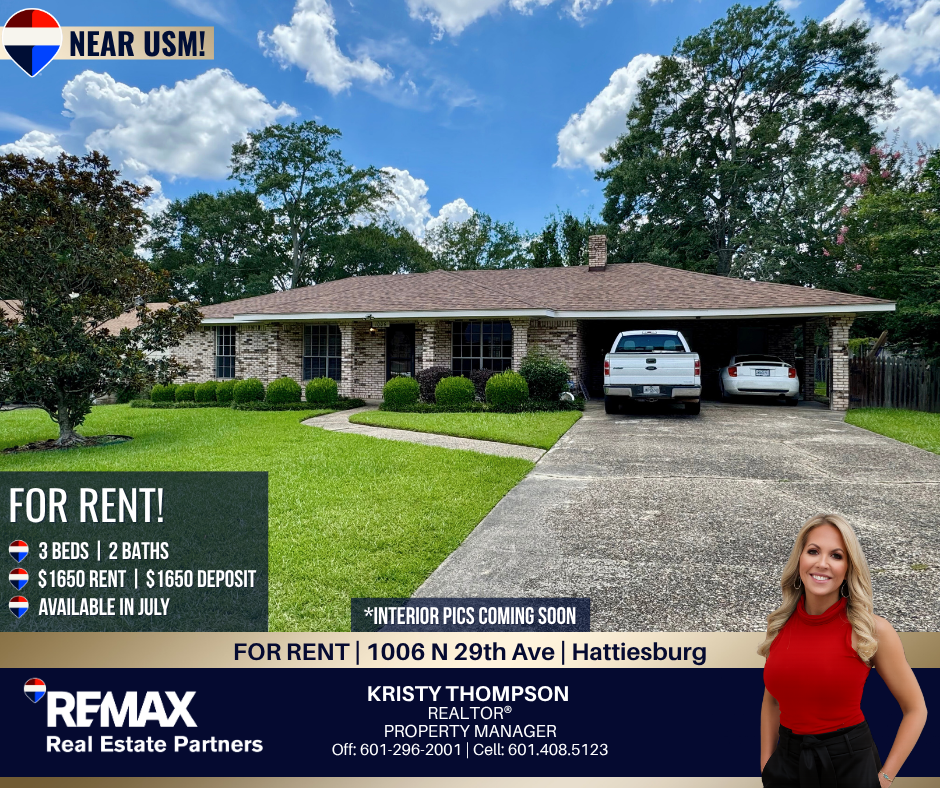 4 Minutes from USM! Fantastic, lovingly cared for, 3 bedroom, 2 bath home with fenced in backyard, covered back deck, beautiful landscaping and outdoor storage. Featuring a large Great Room with vaulted ceilings, fireplace, nice built-ins, dining area and kitchen. Located in a great, quiet neighborhood on a dead-end street just minutes from USM! Roof is less than a year old and central heating & air is only 5 yrs old. Washer/Dryer included. **Home is in process of being painted as well as installation of new kitchen cabinet doors. Interior pics to be posted once work is done by end of next week.** NO SMOKING. Must have appointment to view. NO SHOWINGS UNTIL TUESDAY, JUNE 24TH. Available date: 7/1/25 - MUST HAVE PLANS TO LEASE WITHIN 30 DAYS OF OF AVAILABLE DATE. DO NOT APPLY IF YOU CANNOT LEASE UNTIL AUGUST. SECURITY DEPOSIT HOLD-TIME: no more than 2 weeks from available date of July 1st Appliances: refrigerator, range, dishwasher, washer/dryer UTILITIES: TENANT MUST PROVIDE. Utility Companies are Mississippi Power, City of Hattiesburg Water Billing Dept (water/sewage/trash), Spire Gas PETS: By owner approval, no puppies, aggressive breeds, or large breeds. Non-Refundable Pet Deposit: $350 plus $25/month pet fee | 1 PET MAX APPLICATION & LEASE REQUIREMENTS: Full security deposit and 1st month's rent required prior to move-in. Monthly income (verified by paystubs) must be 3 x's the monthly rent with reasonable credit. Application, credit check, criminal check, pay stubs and photo identification required. Each adult over the age of 18, must complete an application and pay a $40 processing fee. Kristy Thompson, REALTOR | RE/MAX Real Estate Partners | Off: 601.296.2001| Cell: 601.408.5123 | www MaxHattiesburgRentals com