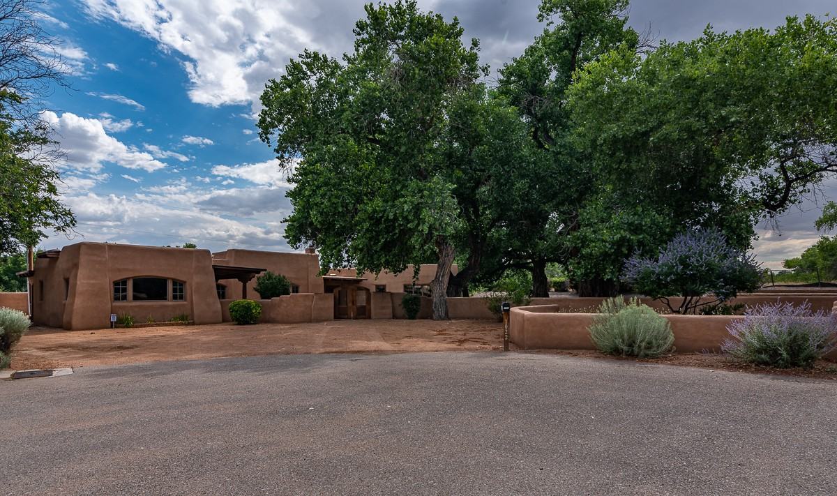 This Custom John Calvin Adobe home sits at the end of a lovely cul-de-sac and backs up against the Rio Grande Bosque open space. Access the Rio Grande and the city's most amazing walking and running trails from your backyard. Large 1/3 acre lot features gorgeous old cottonwood shade trees, lush grass, and multiple courtyards and outdoor living areas (Landscape Maintenance is included with the lease!). Inside enjoy the most quality custom finishes, including diamond plaster on THICK Adobe walls, soaring beam ceilings, brick floors, multiple kiva fire places, and artistic touches around every corner. All bathrooms and kitchen come with the top-end fixtures and finishes with beautiful limestone countertops. Gourmet kitchen offers a large island, custom cabinets, a butler's pantry, and a full stainless appliance package. Flexible floor plan emphasizes comfort and privacy, as each bedroom boasts its own en-suite bathroom and walk-in closet (with custom built-ins and dressers). Master suite is a true retreat, separated from the home in its own wing and includes an enormous walk-in closet, a garden tub, separate shower, double vanity, and plenty of space for multi-functional uses.