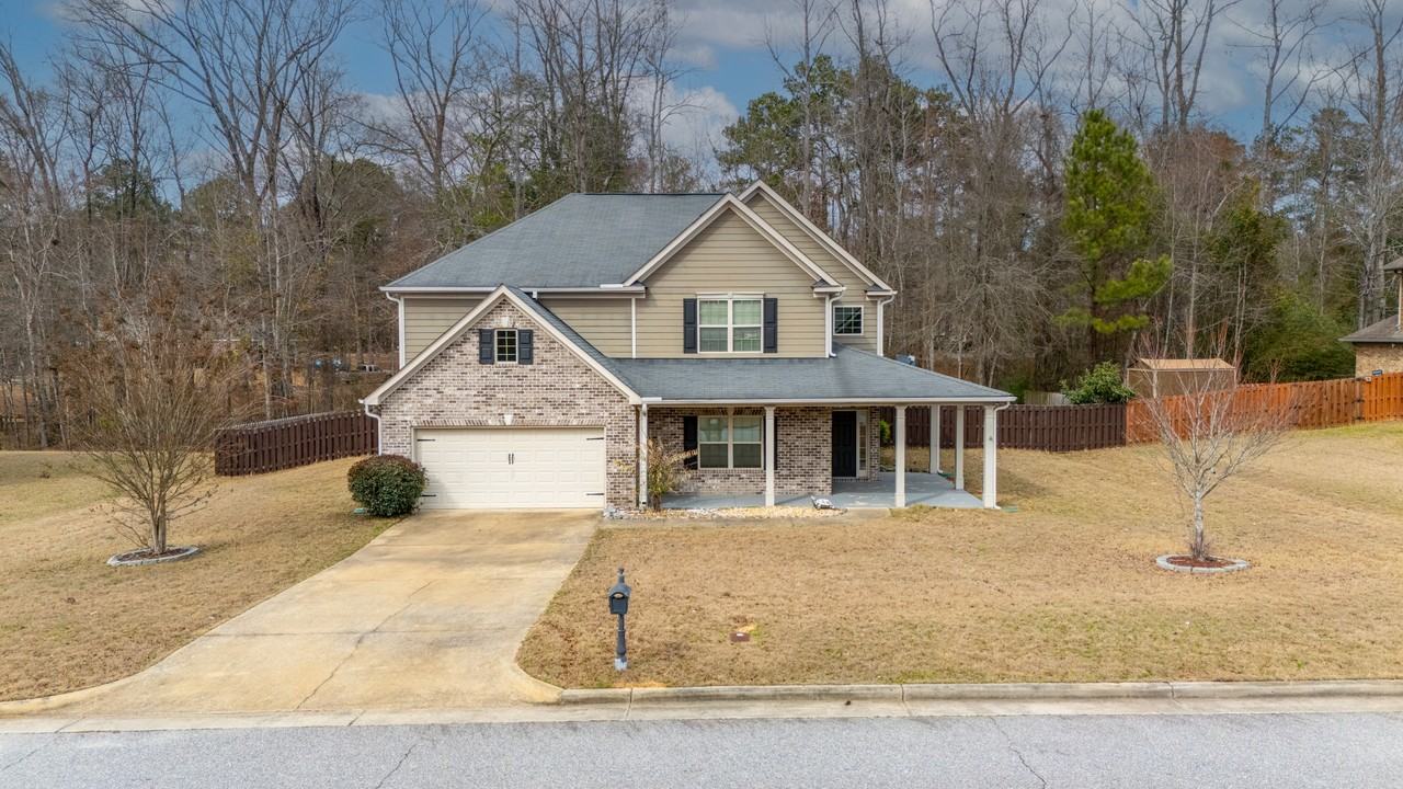 Let the charm of the wrap-around front porch offer a warm welcome and set the tone for whats inside this beautifully designed home in Sable Oaks. With over 3,200 square feet, this residence features five bedrooms, three full bathrooms, and a collection of thoughtful touches including wainscoting, coffered ceilings, built-in shelving, and a 60-gallon water heater to enhance everyday living. The main living area boasts soaring ceilings and an electric fireplace, flowing naturally into the modern kitchen equipped with Frigidaire Gallery stainless steel appliances, granite countertops, a tile backsplash, a dedicated pantry closet, and a breakfast bar that connects seamlessly to the great room. The main-level bedroom suite offers tray ceilings, a spacious closet with a built-in safe, and a private bathroom complete with double vanities, a soaking tub, and a separate shower. A dedicated laundry area is also tucked inside the suite for added convenience. Nearby, a second main-level bedroom offers flexible space for a variety of living needs. Upstairs, three additional bedrooms are situated around a bonus loft-style living area, along with a second laundry room that adds to the homes practical layout. Outside, the fully fenced backyard offers added privacy, while the attached two-car garage provides secure parking and additional storage space.