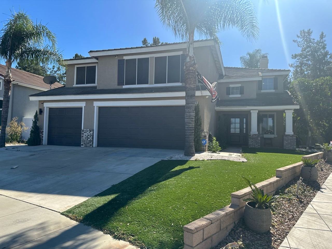 This is a 5 Bedroom, 3 bathroom home located in South Corona. There is waterproof vinyl throughout main areas and nice plush carpet in bedrooms. Upstairs you will find a loft, good sized bedrooms, and an exquisite master bedroom. The master includes a sitting area, fireplace, built in shelving, and walk in closet. Downstairs has one full bedroom, full bath, two living spaces, kitchen, and 3 car attached garage. Beautiful white cabinetry kitchen with black accents includes refrigerator, wine fridge built into the island, microwave, and cook top. There are endless upgrades that include light fixtures throughout, plantation shutters on all windows and more. The front and back yards are beautifully landscaped with artificial grass. Backyard is equipped with a sparking pool and spa, built in bar, water fountain, basketball court and sitting area in backyard. Call today to schedule your showing at 951-684-7510