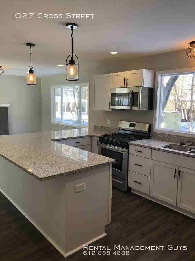 This beautifully remodeled 4 bedroom home features fresh carpet and paint throughout the entire home, kitchen boasts granite countertops, stainless steel refrigerator, gas stove, dishwasher, and microwave. Main floor living room with decorative fireplace, and informal dining room, as well as a 3 season porch and convenient half bath. 4 bedrooms upstairs with a full bathroom featuring his and hers sinks. Largest bedroom has two closets. Large finished basement has an additional decorative fireplace, full bathroom, and washer/dryer. Spacious back yard has plenty of room to roam, and a shed for storage. Two car attached garage. 1 pet up to 40 lbs allowed with additional $350 deposit. Tenant responsible for all utilities, lawn care, mowing, and snow removal. Must have stable income and rental history. All adults to complete rental application and screening. See rental criteria here: http www rentalmanagementguys com rental-application-policies No smoking. Leasing agent is Licensed MN Real Estate Broker.