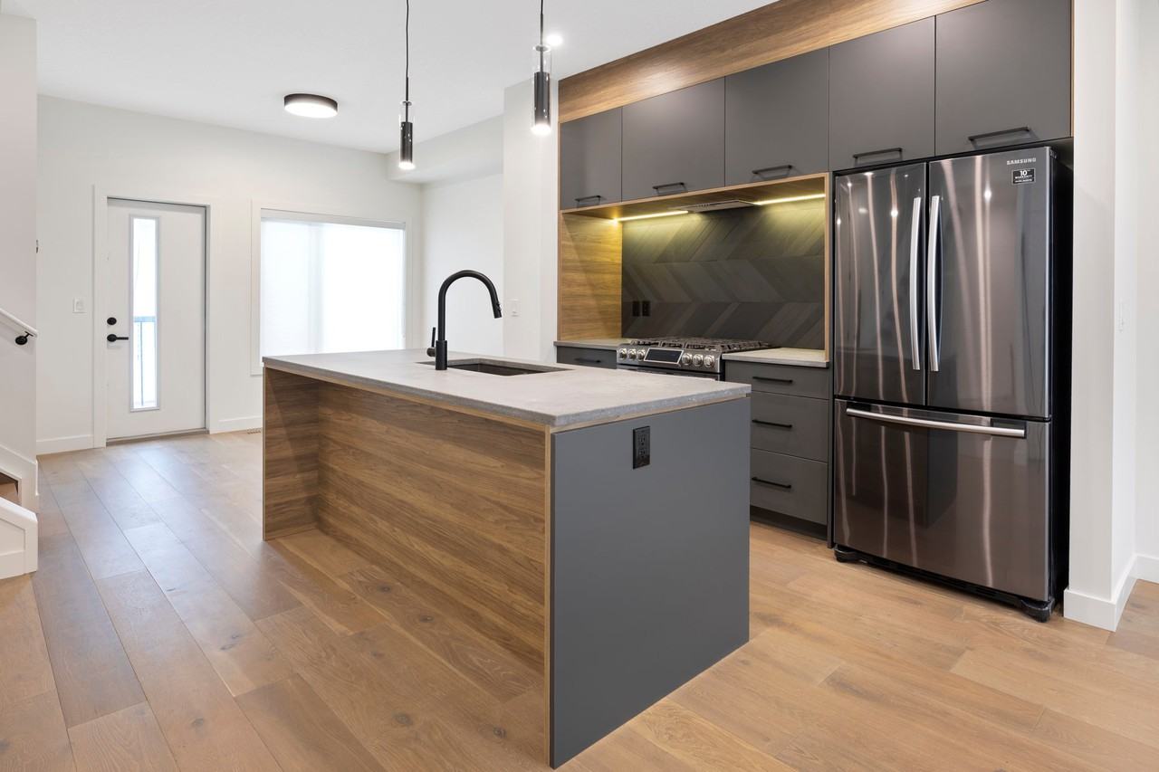 ONE MONTHS FREE rent with a years lease. Ask for details. Copy and paste this link to your browser for a virtual tour: https fb watch geymGozZLc Welcome to the Tribeca7 where executive living is at its best. Feel the luxury throughout this modern townhome located within minutes to Oliver square, Ice District and downtown core. Designed by award winning DIALOG architecture, this contemporary open plan 3 bedroom plus den, 2.5 bath home features a private entry, attached garaged and amazing outdoor patio area. Enter onto the main floor to your open floorplan kitchen and living areas with 9' ceilings. Enjoy contemporary dual tone matte black and wood cabinetry with integrated appliances, quartz countertops, large breakfast bar and black stainless-steel appliances. Floor to ceiling glass wall leads to upstairs where you will find two large bedrooms with large triple glazed windows for extra light. Each room has custom built closet organizers and large walk-in closets. Bathrooms have NuHeat radiant heated tile and designer porcelain tile. The third floor has the primary bedroom with beautiful master bath complete with a soaker tub and walk in shower. A spacious roof level patio with panoramic views of downtown skyline, brewery district and Rogers Place completes this luxury home. Included is a private under drive garage with storage. Utilities are the responsibility of the tenant.