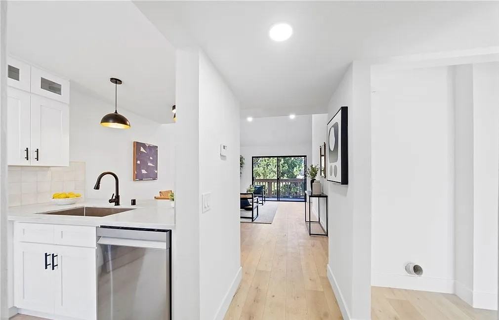 Gorgeous light and bright completely redone upper unit in the heart of Irvine with a community pond view deck and top tier updates throughout. From the convenient nearby carport enter to a stunning great room that starts with a fully renovated chefs kitchen which features quartz counters, all new cabinets, lighting, fixtures and hardware, a breakfast counter bar that opens to the dining room and an abundance of prep and storage space. Perfect for entertaining in style. Next the dining area is open to a large patio view living room which has great light and an amazing feeling of space from soaring vaulted ceilings. The patio is spacious and has views down the length of the community pond and is the perfect place to relax with a morning cup of coffee or an evening glass of wine.