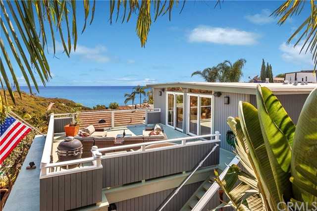 Charming and quaint with expansive panoramic ocean views this 2 bedroom plus den/ office property sits on large private lot with intimate yard. Enjoy forever ocean and canyon views while you cook or entertain in your kitchen with neutral white cabinetry, granite counters and stainless steel appliances. Gather in formal dining room or on oversized deck for dinners and entertainment surrounded by spectacular views. Master bedroom is hidden on lower level with access to the garden with ocean views. Beautiful hardwood floors, surround sound, new roof and windows are just a few upgrades this home has to offer. Amazing street with just short stroll to Moulton Meadows Park!