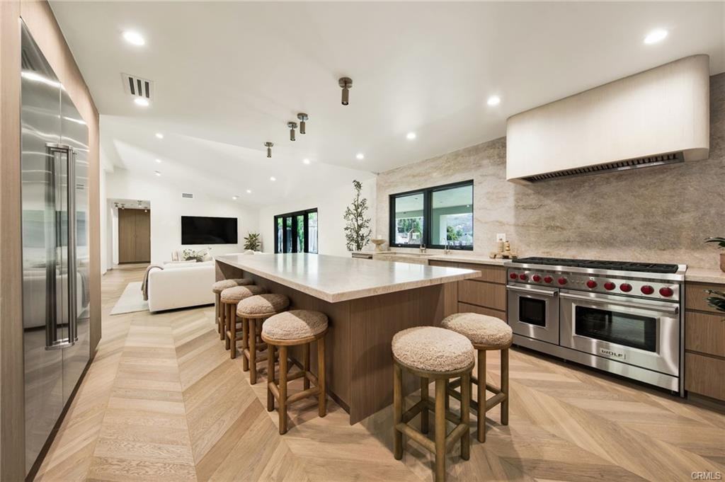 10742 Walnut Drive pairs organic modern design with seamless indoor-outdoor flow for true California living in Shadow Hills. Set on a 16,372 sqft lot, the 3,396 sqft layout delivers 3 bedrooms, a dedicated office, 4 full baths (including a "pool bath"), and 1 powder room (1/2 bath). The expansive lot features a semi circle driveway for easy entry/exit/parking, a pool/spa, spacious covered patio, flat grass yard, and a detached storage. Inside, chevron patterned engineered hardwood flows throughout, with a floor to ceiling Napolean gas fireplace as a centerpiece . Leathered Taj Mahal quartzite surfaces and custom carpentry carry the organic luxury theme throughout. The chef’s kitchen stacks a Sub Zero Designer Series refrigerator beside a Wolf eight-burner range with double ovens, a Cove dishwasher, and a plumbed Miele coffee station. A walk-in pantry and separate “dirty kitchen” add prep and storage space. For entertaining, enjoy a fully finished bar set complete with a mini fridge and cabinetry. Luxurious Phylrich fixtures and matching stone add refinement to the bathrooms and kitchen, while the primary suite adds a soaking tub. The office features wall-to-wall built-in lower cabinets for turnkey work from home. Black-framed windows and doors open to a covered patio, pool and spa, and spacious backyard. Listing provided by: Alex Karibyan of Alex Karibyan LA State License 1989650 A phone number is required if you wish to be contacted. Listing posted by Leasing Office (818) 528-5529. [SYNDID 4122050 06252025]