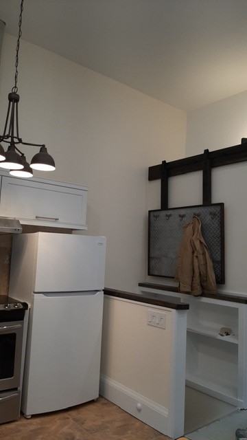 Fully renovated modern studio/1 bedroom unit. New photos coming soon! Must be seen to be appreciated!Very clean & bright. Parking. Coin operated laundry facilities in basement - no storage. Open concept kitchen/living room. New kitchen with custom cabinets, with island, corian countertops and pantry. Cost of kitchen installation $20,000! New 50' wall mounted TV , Half carpet, half hardwood flooring. Custom made bed frame with mattress in bedroom. Mirrored doors in closet. Led pot lights in ceiling. Frameless frosted glass sliding door for bedroom. Living room and kitchen ceilings are 14' high with 18 pot lights. Living room is fully carpeted. Kitchen is vinyl tile. Porcelain tiling in bathroom, oak vanity with granite countertop. Unit is air conditioned. Comes with toaster oven and vacuum. Spacious walkout to 2 level deck overlooking backyard. Includes new gas BBQ. Close to all amenities. 8 minute walk from Victoria Park Subway. Small dogs allowed, no cats. No smoking. First and last month's required. Must be clean. References a must. Available April 1st. Please contact Raymond at (416) 887-3645 for inquires.