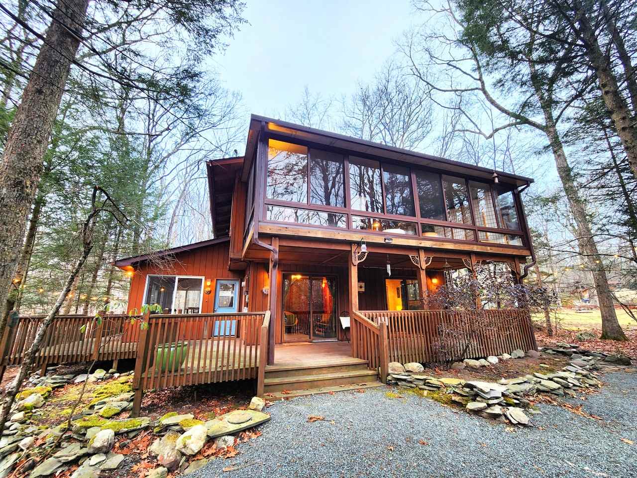 Nestled in a peaceful wooded setting, this charming 4-bedroom, 2-bathroom home offers the perfect blend of rustic charm and comfort. The spacious open-concept living area features vaulted ceilings, large windows, and a cozy wood-burning fireplace, creating a warm and inviting atmosphere. The kitchen boasts beautiful wood cabinetry, well-maintained appliances, and an adjacent dining area that complements the home's rustic appeal. A standout feature of this property is the two beautiful sunrooms—an upper-level enclosed retreat with treehouse-like views and a lower-level sunroom with terracotta tile flooring and skylights, perfect for relaxation or entertaining. Each of the four bedrooms is designed for comfort, offering serene wooded views and ample storage. The updated bathroom includes a newly renovated spa-inspired space with a sleek glass-enclosed shower. Outdoors, the large wraparound deck and private backyard, complete with charming string lights, provide an ideal setting for gatherings or quiet evenings under the stars. An attached storage room at the back of the house offers extra space, and the large driveway provides plenty of parking. Located in a gated community, this home offers tranquility while being just minutes from shops, dining, and outdoor recreation. Available for occupancy on March 1st, the owner is willing to rent the home furnished, partially furnished, or unfurnished to suit your needs. Dogs will be considered with pet deposit, small caged pets okay. Whether you're enjoying the cozy fireplace in the winter or the peaceful natural surroundings in the summer, this home is a true year-round retreat. Make your appointment today!