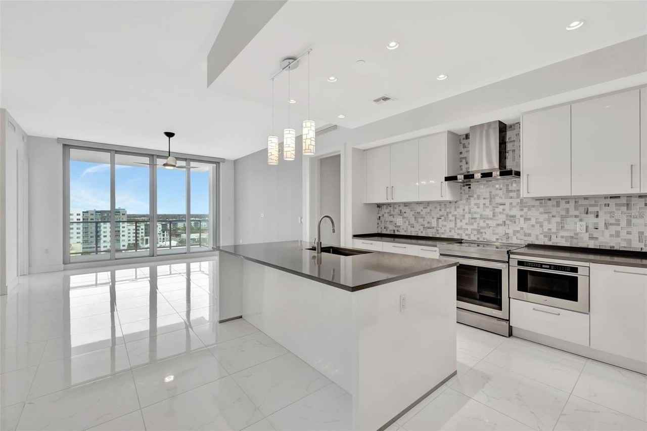 Welcome to one of the most desirable residences in The Mark Sarasota. This stunning 2-bedroom, 3-bathroom condo offers 1,575 square feet of modern elegance with multiple terraces and breathtaking downtown views. Situated on the 11th floor, this move-in-ready home features beautiful design elements, clean lines, and high-end finishes, all complemented by 10-foot ceilings and a thoughtfully designed split floor plan. The sleek modern kitchen is perfect for entertaining, featuring quartz countertops, a large center island with bar seating, upgraded tile backsplash, 42-inch soft-close European cabinetry, and top-tier Jenn-Air stainless appliances, including a French door refrigerator, convection range, under-counter microwave, and wine cooler. Floor-to-ceiling impact sliding glass doors lead to a spacious, covered corner terrace, offering spectacular bayfront and city views. The primary suite is a luxurious retreat with private terrace access and floor-to-ceiling sliding glass doors framing stunning bay views. The en-suite bath features dual vanities with quartz countertops, an expansive walk-in shower with a frameless glass surround, a private water closet, and sleek 24-inch Calacatta porcelain tile flooring. The guest bedroom is equally well-appointed, offering impressive city views and a luxurious en-suite bath with a walk-in shower and frameless glass enclosure. A third full bathroom adds extra convenience for guests. Additional features include a whole-home Sonos sound system, remote-controlled window shades, 12” x 48” porcelain plank tile, a dedicated laundry room with built-in cabinets and sink, and a convenient powder bath. Residents enjoy world-class amenities, including a fitness center, spin room, saltwater lap pool, hot tub, fire pit lounge, poolside cabana, outdoor grills, club room with billiards, catering kitchen and bar, media room, and 24-hour concierge service. Assigned garage parking and a storage locker are also included. The building is pet-friendly, allowing two large pets. Located in the heart of downtown Sarasota, this incredible residence is just steps from premier shopping, dining, and cultural attractions.