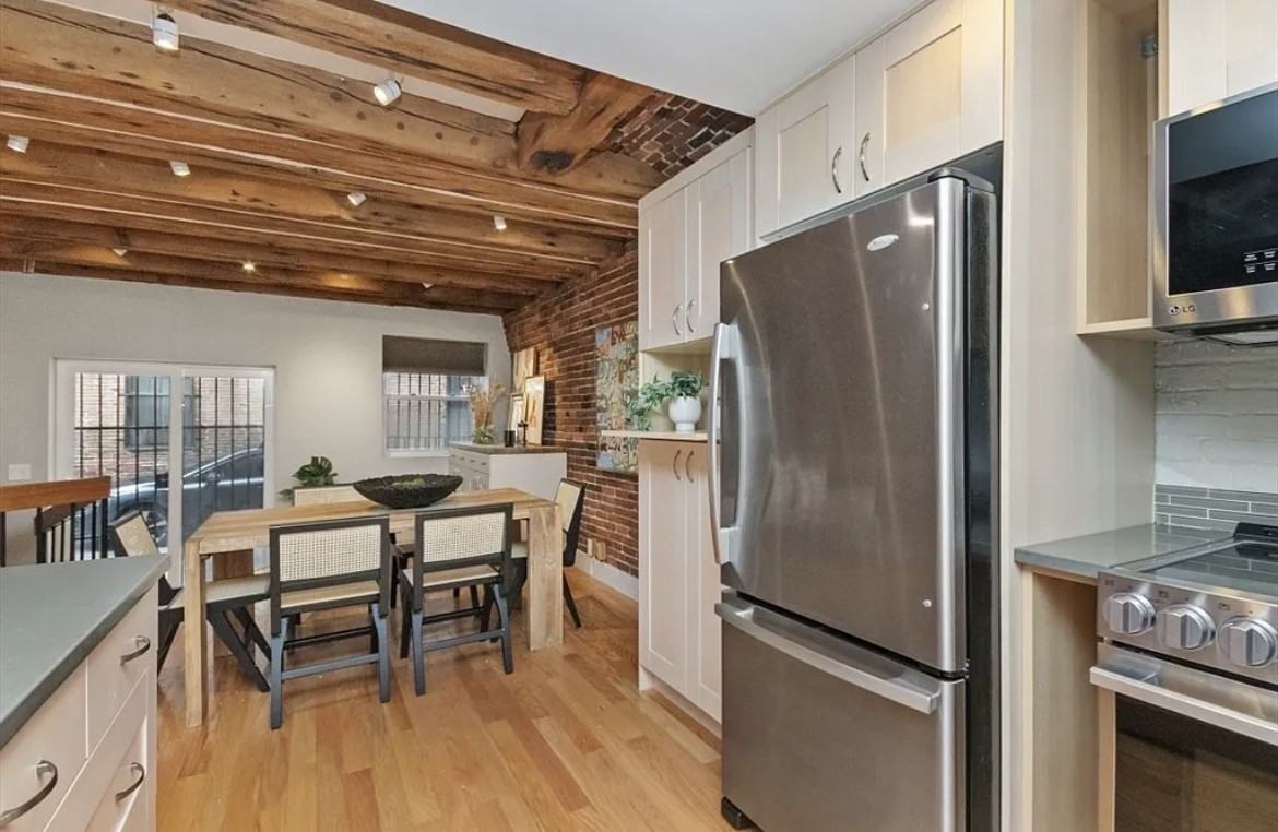 Beautiful Boston Waterfront duplex condominium featuring exposed brick and beam details throughout. This loft-style home is one of the largest one-bedroom units currently available in the North End, offering approximately 908 square feet of living space. The main level features an open and updated kitchen and dining area with hardwood floors and brick accent walls. The kitchen is equipped with newer appliances, an induction stove, and Silestone countertops, with direct access through sliding doors to a charming North End alley. A full bathroom completes the upper level. The lower level offers an additional living area with a built-in work-from-home space and a spacious bedroom with extensive closets and custom built-ins for storage. Boutique, pet-friendly building with convenient in-building laundry. Prime waterfront location in the North End, minutes from Faneuil Hall, the Seaport District, the Greenway, North and South Stations, downtown Boston, and major transportation hubs
