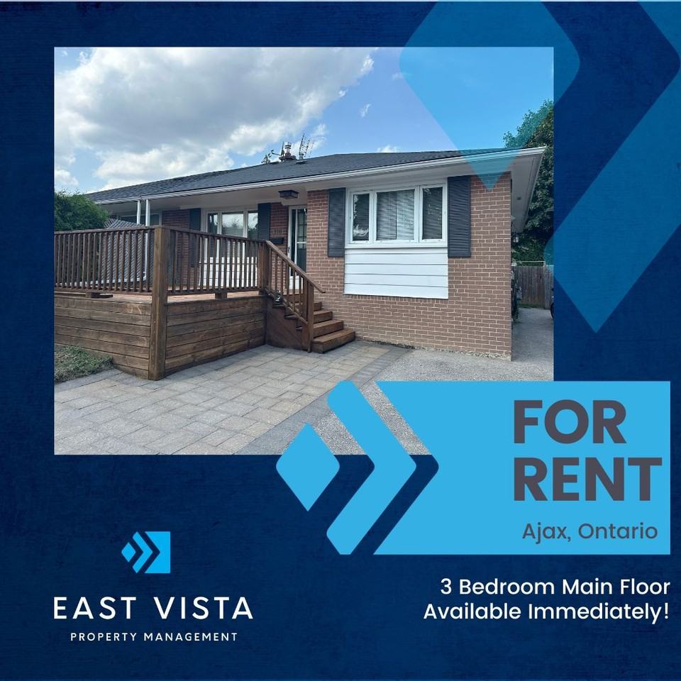 You'll absolutely love this recently updated 3-bedroom, 1-Bath main floor Bungalow available for rent in a mature area of Ajax. This bright and spacious home is conveniently located in a quiet, family-friendly neighbourhood, close to all amenities, including: excellent Schools, Shopping, Dining, Transit and Recreation. Literally just steps from Carruthers Creek Public School. Just a short walk or drive to miles of recreational trails and the Ajax Waterfront. Easy access to Hwy. 401 at Salem Road. Features include: - Spotless, well-maintained property - Well-equipped Kitchen, with Stacked Laundry - Gleaming Hardwood Floors throughout - Spacious Living Room with large Window - Freshly painted throughout - Private use of Backyard, with Deck and Garden Shed - Updated 4-piece Bath - Parking for 2 cars - Large front Deck - Separate backyard space, not shared with Lower Unit Tenant $2350.00 per month, plus 70% of Utilities. First and Last Month's Rent, Photo ID, recent Credit Report and proof of Income required.