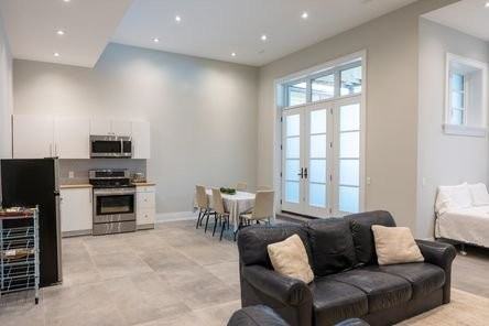 Incredible bachelor basement apartment. 14ft ceilings , open concept living and massive walk in shower. French doors and large windows that face the backyard allow for lots of natural light. You would never know you are in basement! Apartment comes furnished with a bed, leather couch and chair, carpet, and dining room table and chairs. It has its own washer and dryer unit, along with in floor heating throughout the space.