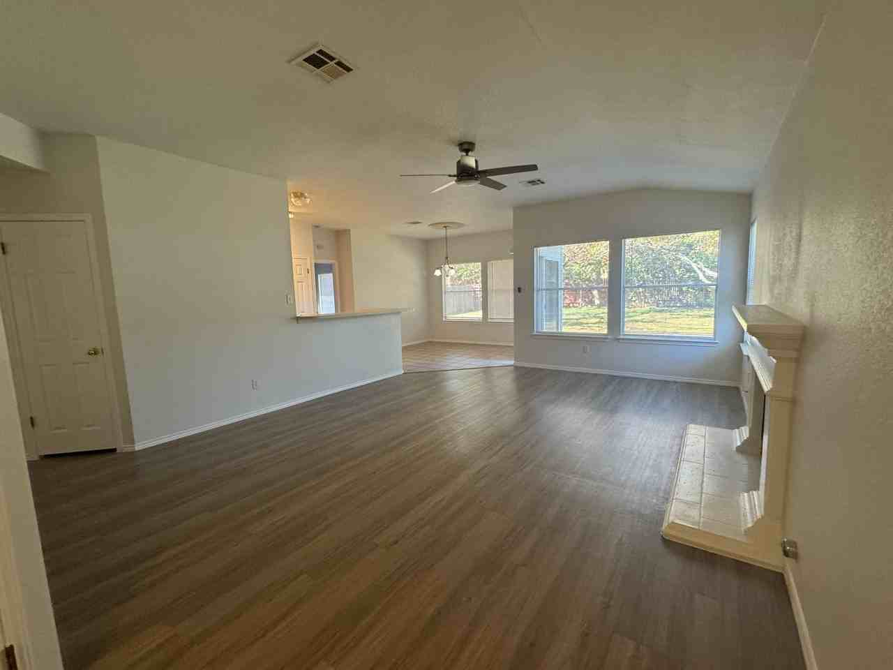 Spacious open-floor plan with a big kitchen and lots of light. Fresh Paint! No carpet! Several storage closets and a 2-car garage give you plenty of places to store all of your stuff. Enjoy the great outdoors in the large back yard. Close to to Giddens Elementary School and Baghdad Park. Come and see before it's gone! All carpet in photos has been replaced with vinyl planks.