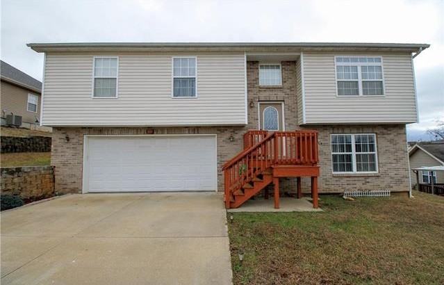 This 3 bedroom, 2 bathroom split foyer home is in a great subdivision that is just 6 miles from the front gate of Fort Leonard Wood. the kitchen features beautiful custom cabinets with center island and breakfast bar. The open kitchen, dining, and living room flows nicely and is spacious with a tall vaulted ceiling. The 3 bedrooms and 2 bathrooms are all on the main level, with the lower level featuring a very large family room. With a deck, patio, and wooden privacy fence, the flat back yard is a great place for entertaining guests.