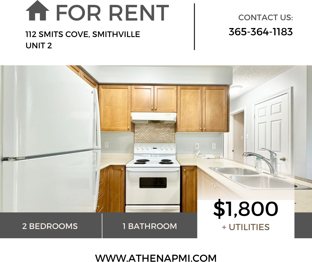 112 Smits Cove- Unit 2 Discover this quiet and well-maintained upper-level apartment in Smithville! With 1,000 sqft of living space, this 2-bedroom, 1-bath unit offers: -Fridge, Stove -Central Air -On-site Coined Laundry -Shared front entrance -Private side entrance/balcony -Shared indoor storage -Parking lot availability Rent: $1,800/month + utilities Availability: As soon as October 15 To book an in-person showing, please call the number or use the link below: 365-364-1183 https app tenantturner com listings athenapmi (Copy and paste to browser if needed) For a virtual video tour (if available), please email us at: ****