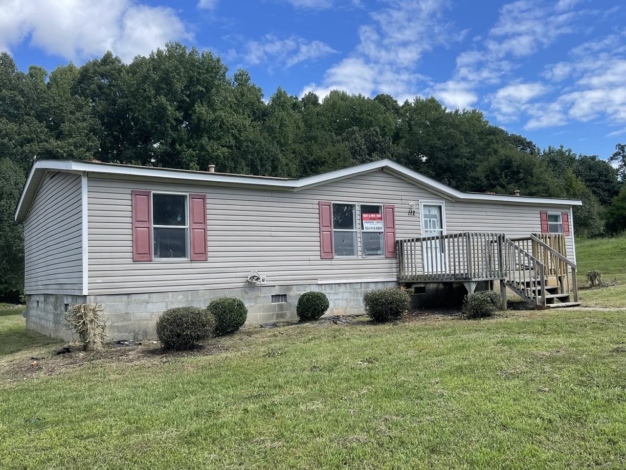 PLEASE READ THE ENTIRE AD FIRST! We will pull this ad as soon as it is under agreement with a Deposit Please DO NOT ASK IF IT IS STILL AVAILABLE! 112 SYDNEY LN. GRAY COURT SC 29645 CLEAN 3 Bedroom 2 Bath Double Wide FRESH PAINT, NEW VINYL LAMINATE FLOORING 2 Bedrooms have carpet NO CREDIT CHECK Vinyl Siding and Newer Roof Front deck AND Rear Deck overlooking LARGE yard Large Master Bathroom Open Floor Plan Separate Family Room with fireplace AND Living Room Central Heat and Air ALL ELECTRIC Public Water Laurens Water and Laurens Electric Large Eat in Kitchen AVAILABLE 12-9-2023 Just finishing up some cleaning and painting Nice PRIVATE location We supply the Range and Dishwasher ONLY. The Resident supplies the refrigerator, washer dryer Pets considered at additional expense NO VICIOUS BREEDS per the Insurance Company PLEASE DRIVE BY THE HOME, Check out the Neighborhood LOOK THROUGH THE WINDOWS AND IF FURTHER INTEREST, Text your email address and send a second text "112 " we will email you an application to be completed and returned to get you pre qualified FIRST before we have any showings of the inside. Please call FIRST to get the direct number for application request. We Will Pull this ad as soon as the home is under contract or rented and no longer available so please do not ask if it is still available RENTAL ONLY TERMS: $1,185 First months Rent PLUS $1,185 Security Deposit AND $1,185 Last Month Rent AND VERIFICATION OF INCOME. We will be looking for $3,600 per month net verifiable income to qualify. (If moving to the area, less than 2 years on the job, self employed or previous evictions/collections- Will require an additional deposit) Total Amount Required for move in: $3,555. WE DO NOT DO A CREDIT CHECK NO WE WILL NOT WORK WITH YOU ON THE SECURITY DEPOSIT or HUD Vouchers RENT WITH OPTION TO PURCHASE TERMS: $3,500 Option Fee PLUS $1,185 Monthly Rental payment prior to move in. $1,185 per month for 2 years and we will credit $100 per month for 2 years and deduct that from an owner financed purchase price of $189,900 NO BANK QUALIFYING. Total Move in needed is $4,685. It is possible to start out renting and convert at a later date within 6 months to the Rent with Option at additional cost. PETS/ANIMALS: $300 NON refundable Pet Accommodation Fee per pet PLUS $30 per month per pet added to the monthly rent. Absolutely NO VICIOUS BREEDS per our insurance company. This would include breeds such as Doberman, German Shepherd, Pit Bull, etc. Small and medium dogs only. No charge for application. Applications can be received by email by request by texting to our phone number once you call us. Contact Rob