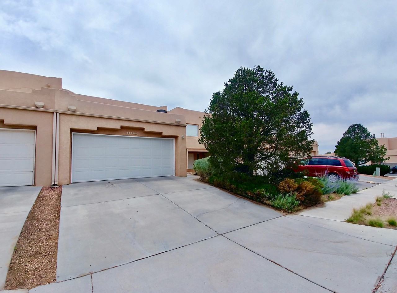 Welcome home to this updated 4 Bedroom Pueblo style townhouse in a tucked away Northeast Heights subdivision. Greeted by an open front foyer showcasing a smart decorative nicho, and a sensible center-hub style floor plan with easy access to the kitchen, living room, or upstairs living quarters. Recent updates include brand new Luxury Vinyl Plank downstairs, fresh bright white paint throughout, and plush new carpet continuing from the stairwell to all the upstairs bedrooms. You'll find a great open living room/ kitchen concept with large and bright windows, easy backyard access, and plenty of space for large furniture. The galley kitchen offers an eat-in area, two counter spaces, and a brand new refrigerator on it's way! The downstairs bedroom could double as a great office space, craft area, or second living space with shelving and a large walk in closet. Get away with a cozy master suite upstairs boasting a walk in closet, an oversize bathroom counter, and a separate bathing area. Convenient amenities include a gated front entry for additional security, washer/dryer hookups, automatic two car garage, and a small backyard with patio space to enjoy the warm summer nights. Call Deacon Property Services to schedule an appointment at (505) 878-0100.
