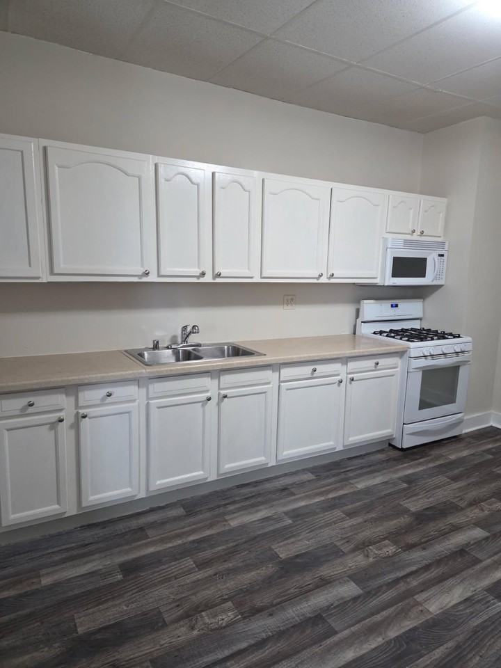 - Kitchen with refrigerator/freezer, stove, microwave oven
