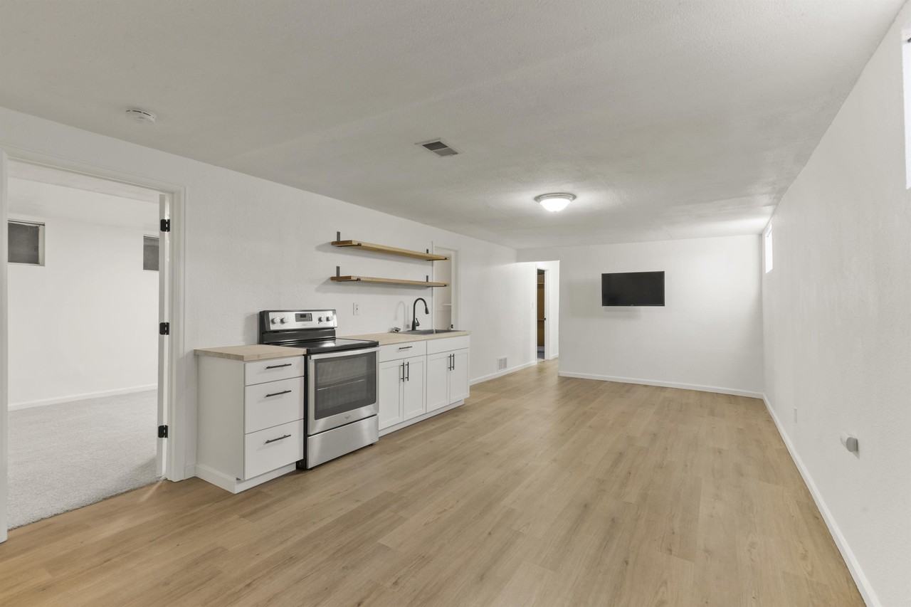 Basement apartment in a newly renovated Duplex style home. Featuring: a private entrance, an open style kitchen/dining/living area, the kitchenette has a flat top stove, sink, cabinets & open shelving; 2 bedrooms with new carpet, 1 bath with a tub/shower combo, living room area, smart TV, washer/dryer hookups, fenced back yard. Close to Ft Carson and other military installations