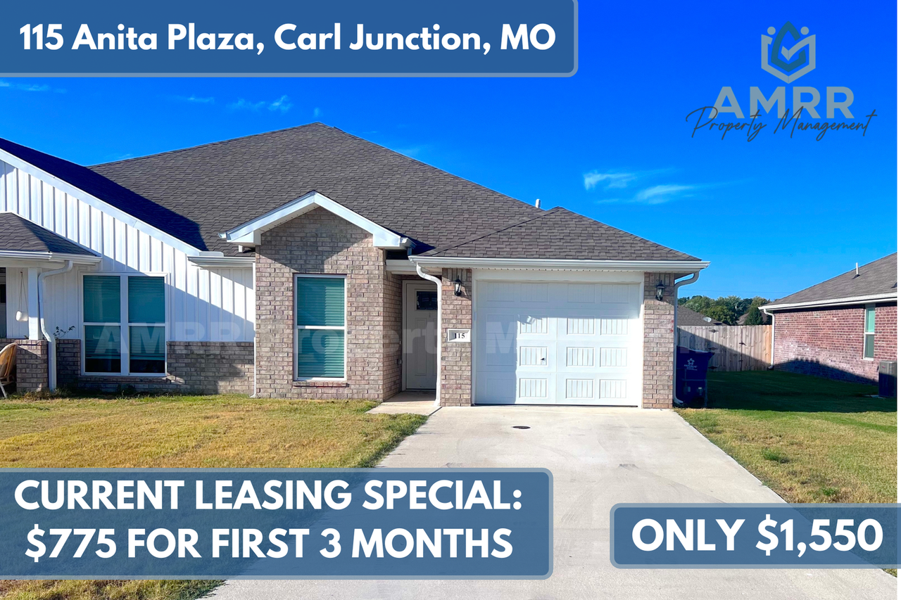 FALL SPECIAL: $775 for first 3 months of 12+ month lease. Rent reverts to $1,550 after. Welcome to your new home with AMRR Property Management, featuring 1,450 square feet of living space, 3 bedrooms, 2 baths, and a 1 car garage. This new construction home is located in a quiet development in Carl Junction, Missouri, and it has everything you need in a rental. The kitchen features a stove, microwave, dishwasher, custom cabinets, a stainless steel fridge, and vinyl flooring that extends throughout the home, with the bedrooms having carpet. The backyard includes a relaxing covered patio and a spacious grass backyard. Length of lease can be between 12 and 24 months. Utilities are ALWAYS the responsibility of the tenant, unless otherwise advertised. Tenants are responsible for all lawn care and maintenance during tenancy, unless otherwise advertised. Security deposits are required for most properties, but we offer various deposit amounts and payment options, which are determined during the application process. Application fees are generally $45 but few can waive the application fee if an application is filled out within 24 hours after you complete a scheduled showing with one of our leasing agents. Normally, only 2 pets are allowed per property and we charge a one-time pet fee of $250 per pet, with no breed restrictions or weight limits, unless otherwise advertised. No smoking of any kind is allowed inside the property or garage.