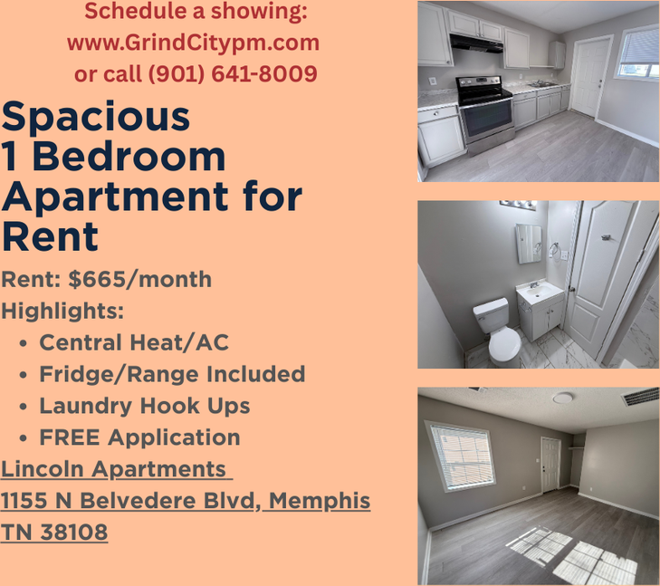 Newly Renovated 1BR/1BA – Lincoln Apartments | 1155 N Belvedere Blvd | Section 8 Welcome Spacious living room, Central Heat/AC, Washer/Dryer hookups, Fridge + Stove included. $30/mo water & trash. $600.00 Security Deposit. Optional utility setup: Keep utilities in owner's name for $20/mo + $200 deposit. Section 8 & all rental assistance accepted. FREE application + FREE background check. Application Requirements: - Application & Background Check are FREE - Section 8 & Rental Assistance Accepted - Income must be 3× the rent (Section 8 applicants exempt — voucher must cover rent) - No evictions or rental judgments in the last 3 years - All adults (18+) must apply - Criminal background reviewed case-by-case Apply Online Today: www grindcitypm com Questions? Call/Text (901) 641-8009
