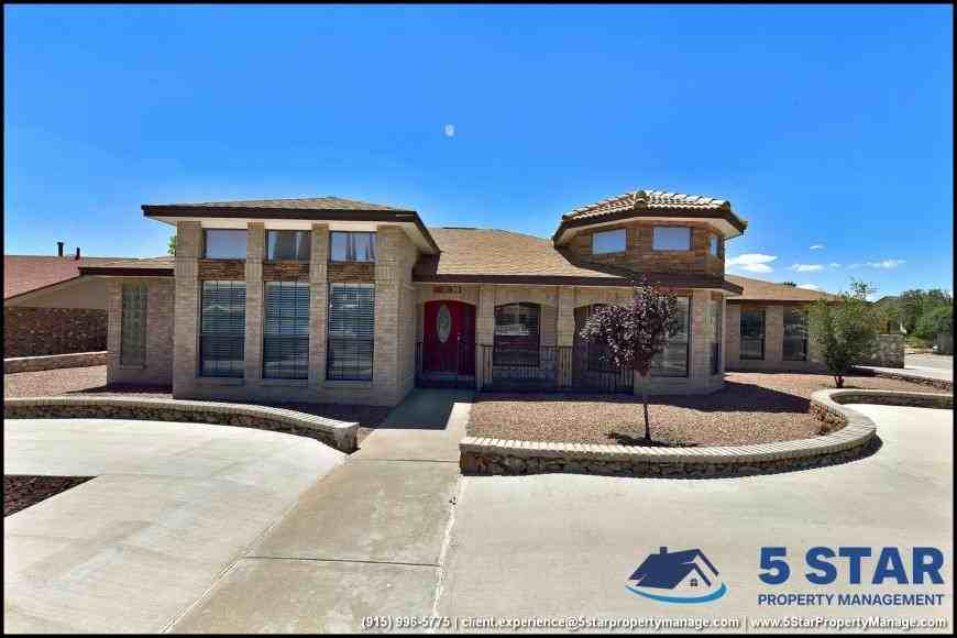 ZMP91330615 - Warmly crafted 3-bed, 2-bath home where arched passageways and stately columns evoke timeless architecture. The open living area boasts a classic stone-clad fireplace beneath a recessed ceiling, while shuttered windows welcome soft desert light across polished tile floors. A sun-drenched dining nook sits beneath a turreted ceiling, its chandelier casting an elegant evening glow. The kitchen offers traditional charm with natural oak cabinetry, polished granite counters, and stainless steel appliances. Step outside and discover the home\'s signature feature: a glistening inground pool with a curved waterslide and a built-in jacuzzi, perfect for both playful afternoons and tranquil nights under the stars. A red-tiled gazebo provides shaded comfort, extending outdoor living year-round. Located near Tierra del Este Park and Eastwood High School, this residence pairs architectural warmth with everyday resort moments. Deposit-Free Renting service to Obligo qualified renters, fees may apply. For Showings information and availability, please call at 915-320-7027 By: 5 Star Property Management EL PASO Texas Rentals EL PASO Property Management Property Management in EL PASO *Important: Information is deemed reliable but not guaranteed. All information is submitted subject to errors, omissions, change of price before the lease, or withdrawal without notice.