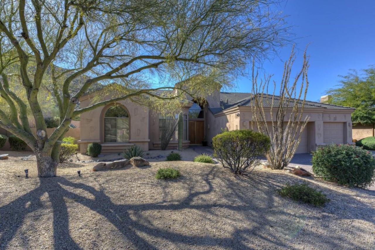 This designer home has been updated with a soft contemporary look. The furniture is high end decorator finishes. Large views of the McDowell Mountain's with views of a large pool and heated spa. The rooms are large and spacious with a wonderful eat in kitchen. Enjoy your private peaceful mountain views as you sit under your covered patio with luxury patio furniture. Large master suite with split bedrooms. Two other bedrooms spacious in size and 2 full baths and powder room. There is luxury furniture throughout with TV's in every room.