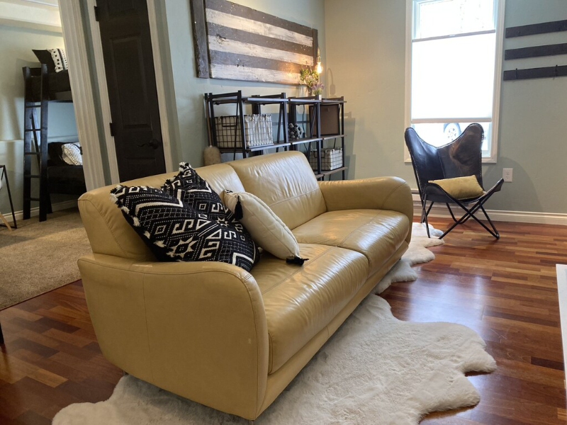 Property Id: 1530343 Breja Hause Apt has fully furnished spaces. The two bedrooms have queen beds with linens, down comforters, textural throws, a chair, smart tv, with full sized built in closet/suit case rack so you can completely unpack. Living spaces have a mid-century "FRESH" feel with a full sized leather couch and a butterfly chair flanked by bespoke artwork. The living room's smart tv is attached to rough- hewn wood "art wall" with an electric fireplace to make the space feel cozy for your stay. The kitchen has bar height table and additional 9 ft side bar to fit in extra friends. Enjoy beautiful meals? All dishes are white and black for trendy home cooked meals. The full bath is fresh, clean and cute... with enough hooks in bedrooms and bathroom to keep your towels neat. The apartment laundry room and coat closets have shelving and space for items to be stored outside your bedroom. Note: Deposit is 1000. with a 200. transition/ deep cleaning fee (standard for mid term rentals)