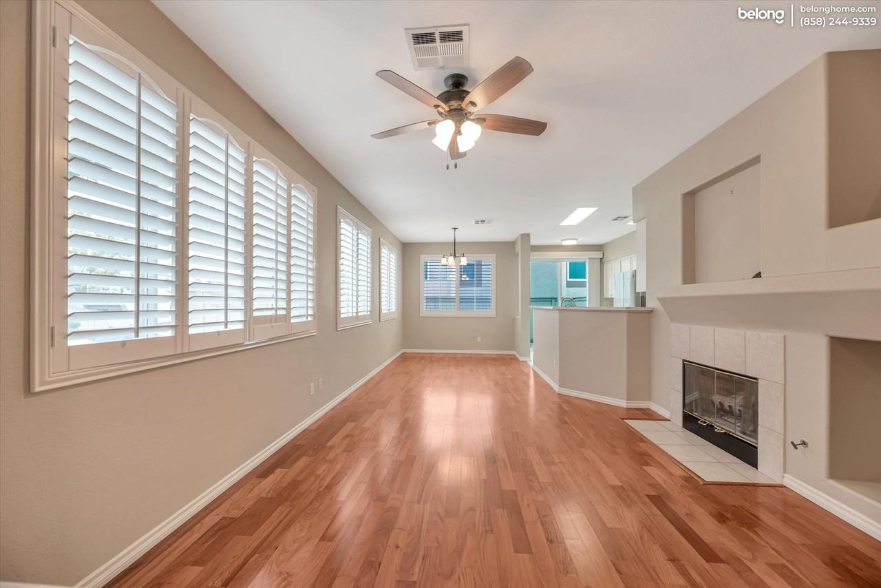 This charming 3-bedroom, 2.5-bath townhome unit welcomes you with gleaming hardwood floors and the warmth of the California sunshine streaming in through numerous windows. It has plantation shutters that provide just the right amount of shade. And with central A/C, heater, and smart thermostat installed, you can easily adjust indoor temperature to your liking. Get ready to whip up culinary delights in the sleek and modern kitchen, complete with gorgeous marble counters and top-of-the-line stainless steel appliances. The French-door fridge, microwave, dishwasher, vented hood, and full gas range with oven are sure to impress! Plus, a water filter, water heater, and water softener have been thoughtfully installed for your convenience. Make your way upstairs to find all three bedrooms, each one providing a cozy and private space to unwind. The primary suite features an elegant ensuite with a shower-over-tub and a double sink vanity with marble counters, creating a modern aesthetic that's both functional and stylish. The attached 2-car garage with automatic doors lets you park your vehicles with ease. Plus, laundry facilities located in the garage save you time and hassle! Take advantage of the idyllic San Diego weather all year long by relaxing in the serene backyard. This home is also pet-friendly, so your furry friend can join in on the fun! 11865 Spruce Run Drive is located conveniently close to freeways, schools, shopping, dining, and entertainment. With a central location close to all the amenities you need, this home is not to be missed! *Fireplace is decorative only.