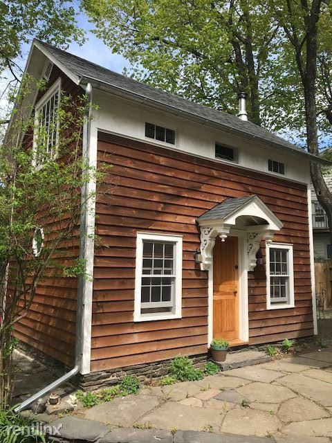 A two-story one-bedroom house just off the center of the Village Green. Completely renovated and insulated with new electric, plumbing and bath fixtures. Dutch hood entryway with antique corbels over a 200 year-old pine door. The ground floor has a new Jotul gas stove with decorative fireplace mantel, exposed beams and wainscoting. Bathroom includes a tiled shower with a river rock base is a treat for your feet. An old pine armoire from an English parsonage serves as a hall closet. The second floor has a 5-foot square window among others with views of Overlook Mountain. Two bookcases with a media cabinet surround a wall-mounted flat-screen TV. New gas stove, refrigerator and copper sink with custom cabinet base and buffet cabinet/kitchen counter. Vaulted ceiling with iron collar ties and rough-hewn ridge beam. Pine and oak floors. $1400/mo plus utilities. Available November 1st. 1(917)254-3285