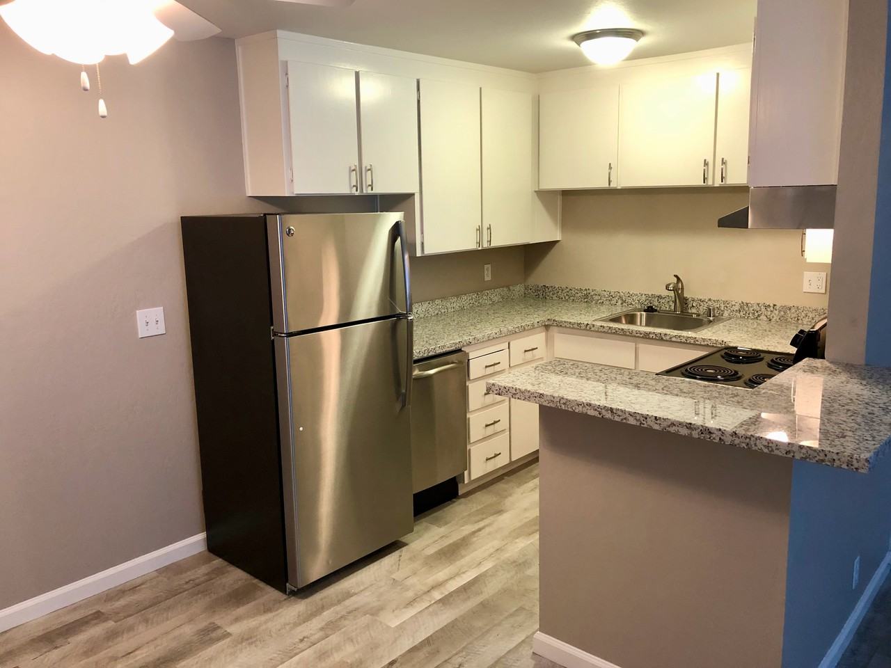 Welcome to Granada Apartments! *Please contact us to schedule an appointment. Unit Features: *Covered under rent control *Ground Floor (Cooler in the summer) *End Unit (one shared wall) *Newly renovated *Granite Counter Tops (New!) *Spacious Bathroom *Laminate Flooring Throughout (New!) *Ceiling Fans in Kitchen and Bedroom *Plantation Blinds (New!) *Additional Walk-in Closet and Plenty of Storage Space. *Forced Fan Wall Heater (New!) *Double-pane storm windows (New!) Amenities: *Professionally Landscaped Grounds *BBQ Picnic Area with 2 grills and Tables *Pool with Poolside Furniture *Covered Parking (plus additional guest parking) *Onsite Shared Laundry (New Machines!) Location: *Easy Quick Access to 101, 237, 85, and Central Expressway *Walking Distance to Caltrain/Light Rail Station and Castro Street/Downtown Mountain View *Near Several Parks (incl. Shoreline Lake/Amphitheater and Baylands) *Minutes Away From Google No Pets/No Smoking