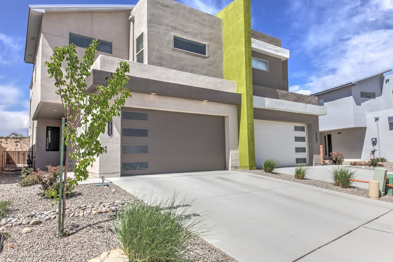 Start living a little more simply in this Silverstar Rated Green Built town home. 2200 SF contemporary design offers the perfect marriage of modern comfort with energy efficiency. Downstairs, enjoy a spacious open floor plan with sleek tile and exceptional natural light. Great room gives way to formal dining area, and super luxurious kitchen with quartz counters, a huge island / bar, a professional Frigidaire stainless appliance package, gorgeous custom backsplash, and a walk in pantry. Energy efficient Low E windows throughout, zoned air conditioning on Nest Thermostats, and a tankless water heater. Master suite features a covered view balcony, a huge walk-in closet, and a large bath with double sink and oversized shower. Two guest beds, laundry room (with HE front loader washer / dryer) and a big loft space / 2nd living area complete the upstairs. Finished two car garage with epoxy coated floor. Landscape is low maintenance with a covered patio overlooking open space and perfect for outdoor dining. Exceptional location in Volterra Villas subdivision, with quick and easy access to Kirtland Air Force Base, Sandia National Labs, great trails / open space, I-40, shopping, restaurants, movies, and great entertainment.