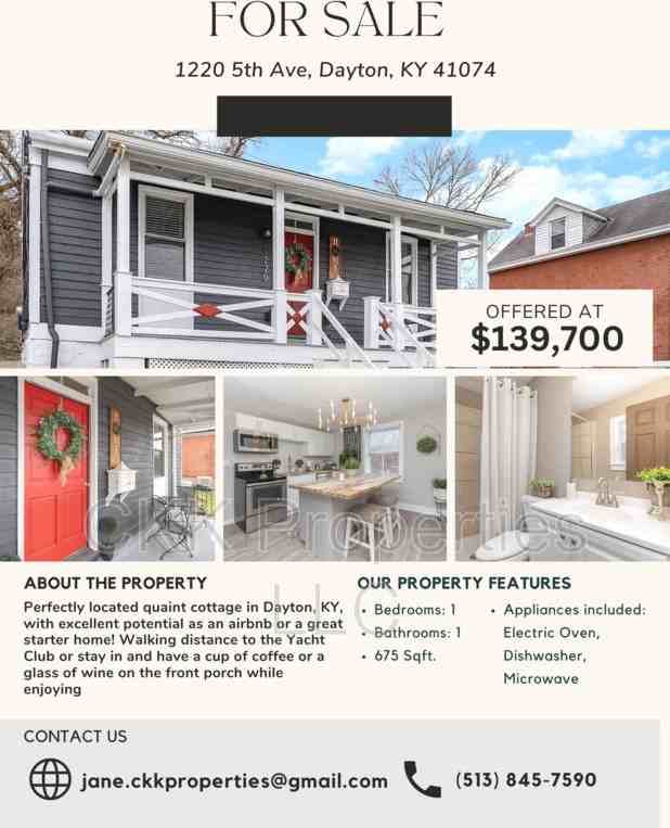 Perfectly located quaint cottage in Dayton, KY, with excellent potential as an airbnb or a great starter home! Walking distance to the Yacht Club or stay in and have a cup of coffee or a glass of wine on the front porch while