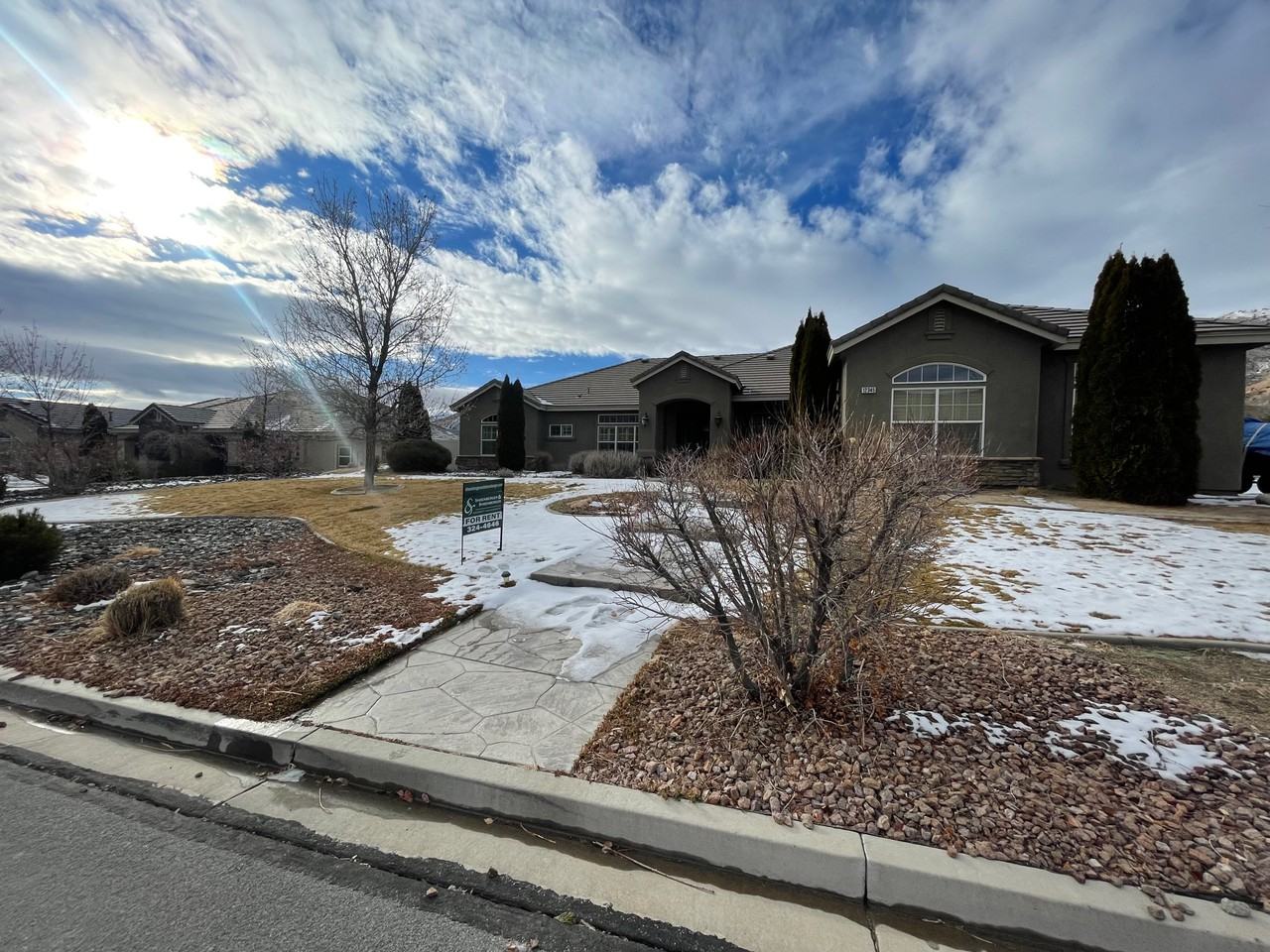 5 Bedrooms, 3 Bathrooms, 4 Car Garage. Rent $3,775, Deposit $3,765. 3488 sq. ft. Includes fridge, W/D, D/W, gas stove, microwave, A/C and double pane windows. Two pets 75 lbs. or less, upon approval, with an additional deposit of $500 per pet. This HIGHLY UPGRADED ranch style 5 bedroom, 3 bathroom home with an attached 3 car garage plus a free standing 4th garage on a .90 acre lot is located in the upscale community of PEBBLE CREEK off of Pyramid Highway in Suburban Sparks. Recent upgrades include brand new upgraded carpet throughout, brand new 2-tone paint with a designer color on the walls offset by white baseboards throughout and brand new LED light fixtures throughout. A thoughtful design of the home provides an abundance of light while maintaining perfect privacy. The open floor plan has an inviting feel with grand ceilings that are over 10-feet in height. Natural stone tiling can be found in the entry, kitchen, hallways, all 3 bathrooms and the laundry room. The large gourmet kitchen with lots of high end very well-maintained cherry wood cabinets, loads of solid granite countertop space with solid granite back splash and a large walk-in pantry plus a breakfast nook merges as one with the large family room that has a granite tile accented corner gas log fireplace and a very large highly upgraded built-in entertainment center. The very large master suite comes with a very large master bedroom that has a ceiling fan and a private exit to the patio; a very large master bathroom with separate raised his and hers vanities and a separate grooming area for the lady of the house, a huge jacuzzi tub and a separate shower stall with a sitting bench plus an oversized California Style walk-in closet with lots of custom built-ins. Some but not all of the indoor upgrades include custom window coverings; crown molding in the master bedroom, living room and formal dining room; custom tile design in all of the bathrooms and ceiling fans in all of the bedrooms. Additional features include a large living room/formal dining room, spacious secondary bedrooms and upgraded built-in storage cabinets and overhead storage racks in the oversized garage. Some but not all of the outdoor upgrades include a very large partially covered concrete patio, room for several R.V.s, a large gazebo, an outside kitchen w/ electrical-water-granite-2 burner stove-fan and BBQ and a water feature plus a fire pit. The care of the beautiful landscaping is provided for by the owner. Tenant pays G, E, W, T & S. 1 year lease.
