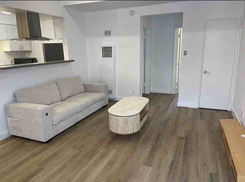 Spacious modern layout 1 bedroom, 1 bathroom first floor unit in quite overlooking the courtyard. Open concept kitchen, living and dining room with beautiful, laminated flooring. All walls in apartment freshly painted. Great patio off the living room. Large bedroom with two closets, new carpet. One good size bathroom, double sinks, new shower fixtures. Kitchen with new stainless-steel refrigerator, microwave, sink.