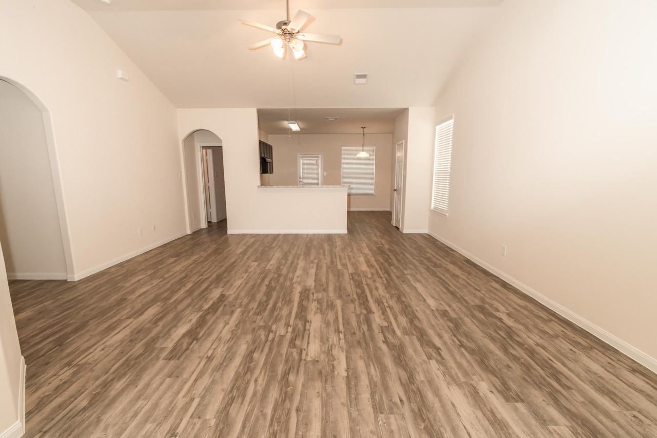 The Danube - 1433 sq ft, 3 bed/2 bath, 1 story townhome. Features wood-grain vinyl plank flooring, two car garage, fenced backyard, and a sprinkler system.
