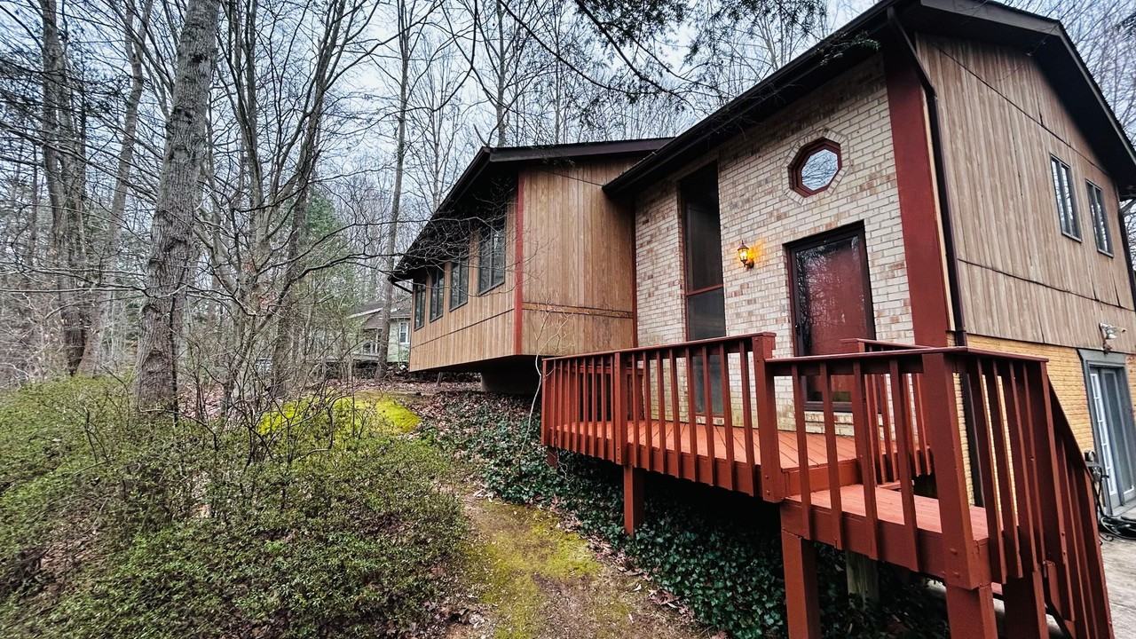 Private 4 bedroom home located on a peaceful 1.1 acre lot. Relax and watch the birds or occasion wildlife from your rear deck. Cozy wood burning fireplace. Contemporary unique home with loads of picture windows. Master bedroom opens onto the deck. Plenty of storage or work space in the basement area. Available immediately.
