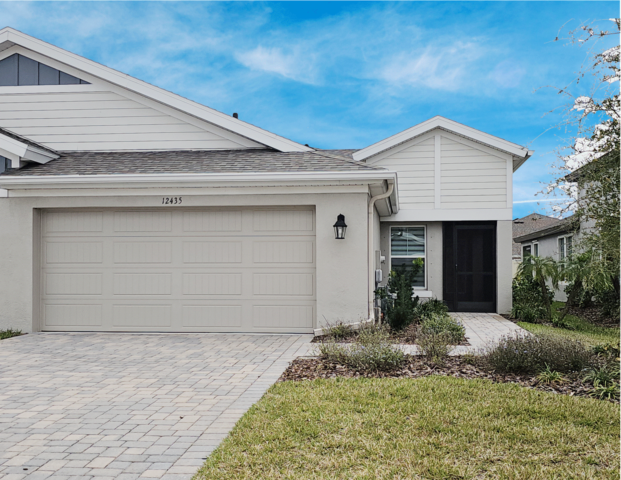 3 bedroom, 2 bath villa with 2 car garage built in 2023. This almost-new home features an open floor plan, beautiful ceramic tile throughout all living areas, quartz countertops in the kitchen and baths, natural gas cooktop, upgraded window-treatments, whole house water treatment system and private patio. Annual rental only. 1 small dog up to 35 pound is permitted, sorry no cats. Community features a heated community pool and cabanas located a short walk away. All lawn maintenance included. Washer/dryer included. 1 small dog (under 40 pounds) is permitted with a $200 non-refundable pet fee.