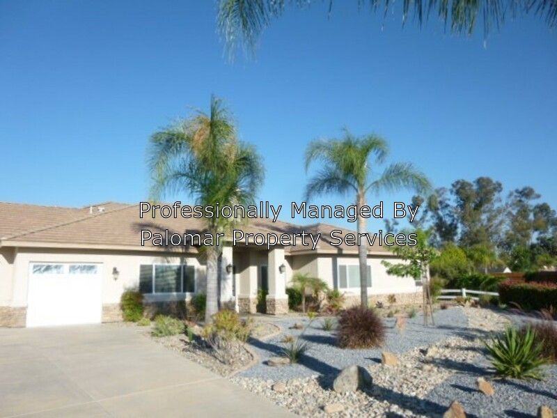 Distinguished custom home with laminate wood flooring boasts 4 large bedrooms, 3 full bathrooms and a very roomy office. Great-room flows from kitchen to living and dining with ample space for entertaining. Attractive granite on top of a beautiful two-tier island, serves as kitchen on one side, and comfortable seating-for-6 on the other. Semi-formal dining area accommodates a full-sized table for large gatherings. Master bedroom retreat is a sanctuary for sleeping and relaxing. Enjoy a pristine landscape in front and a lush lawn and gas fire pit in the fenced backyard. Clip roses from the many varieties that grace the yard, and relax on the covered patios off the great room and the master bedroom. Home sits in a quiet, manicured neighborhood just minutes from all that the quaint town of Ramona has to offer. Pay your rent online 24/7 using our convenient tenant portal! Contact John Boruff, CalDRE#01857648, 760-670-4957. Tenant pays utilities. Owner pays landscaper. Tenant liability insurance required. Thinking about buying a home? Let Palomar Property Services help you get pre-qualified!