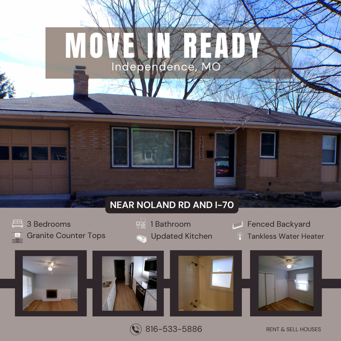 Charming 3 bedrooms and 1 bath brick ranch located on E Erickson Rd in Independence, conveniently near Noland Rd and I-70. This home features beautiful hardwood flooring and an updated open-concept kitchen designed for entertaining. The kitchen offers abundant cabinet space, granite countertops, and all new stainless steel appliances including STOVE, REFRIGERATOR, MICROWAVE, and DISHWASHER. Additional features include a single-car attached garage, unfinished basement, tankless water heater, central heating & Ac, washer/dryer hookups, and a large fenced backyard perfect for outdoor enjoyment. A solid brick exterior and classic ranch layout provide both charm and functionality. Rent $1600.00 - $1600.00 Security Deposit We will require tenants who will take care of the property and treat and care for the property as their own. ****LEASE IS REQUIRED***** Small dog MAY be considered with a $25.00 monthly pet rent and pet screening. If a dog is allowed, the dog will need to be on a leash whenever outside and yard waste cleaned up at all times. 1 small dog under 20 lbs could be allowed with $25.00 per month pet rent and $300.00 NON Refundable PET FEE. Serious Applicants ONLY! Anyone over the age of 18 living at the property must put in a application. Property is RENTED AS-IS. No other improvements will be made. The tenant is responsible pays all utilities, electric, gas, sewer & water. Tenant will provide and maintain renters insurance, general care and general maintenance, i.e., smoke detectors batteries, light bulbs, co2 monitor batteries, filter changes, and maintaining the property as there will be 2 property inspections per year to make sure the tenant is in lease compliance. Tenant is responsible for lawn, snow, trash and all utilities. ***NO SMOKING of ANY KIND IS ALLOWED INSIDE THE PROPERTY*** Property is RENTED AS-IS. We are looking for a long term tenant to take great care of our beautiful home. View our website at www mmpropertypros com CALL or TEXT 816-533-5886 now to schedule a showing with a leasing agent. ***** We will never ask you for a deposit or rent before you have viewed the property.*** Anyone who would be living in the property 18 and over is required to submit their application. Application Fee is $47.00 per person. All applicants are welcome to apply. The landlord does not discriminate based on source of income. Call 816-533-5886 for application. All application fees are NON Refundable. Once application is approved a non refundable reservation fee is required to take property off the market and hold it for your move in date that is to be within 30 days of your approved application. Avoid SCAMS, we do NOT advertise on or FACEBOOK Market place. You will speak and meet with a leasing assistant! This property allows self guided viewing without an appointment. Contact for details.