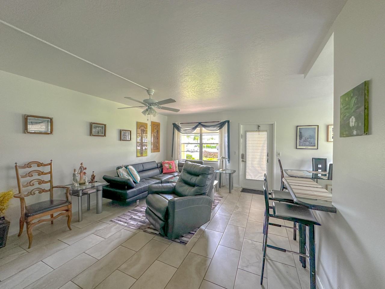 Annual rental in a 55+ community: Fully remodeled first-floor corner 2-bedroom, 2-bath unit in Century Village Boca Raton featuring neutral porcelain tile throughout, a modern white shaker kitchen with granite countertops and stainless steel appliances, updated bathrooms including a master bath with a step-in shower (no tub), and a light, bright screened-in patio with Southern exposure for natural light and breezes.
