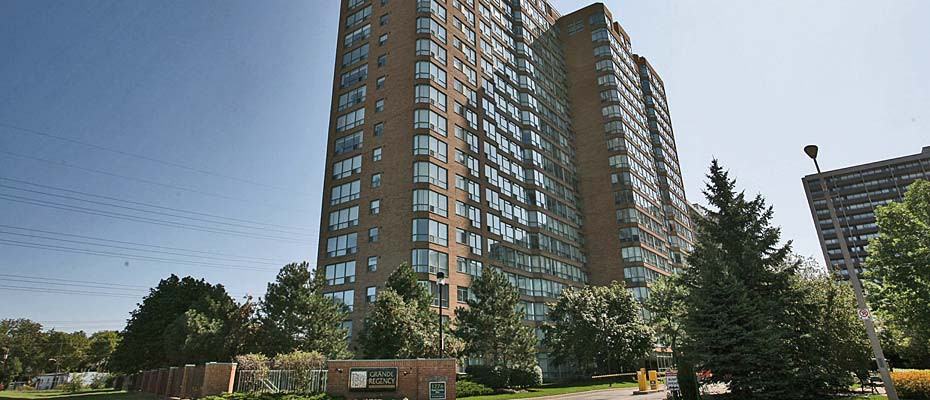 Impressive 1 bedroom + den unit appx 1059 sq. Ft in desirable Grande Regency Condo. All utilities included and building provided cable. This unit features rich hardwood floors, ceramic tile throughout, no carpet. Kitchen with breakfast nook, large living/dining room and spacious family room/den. Master with 4 piece ensuite with soaker tub and separate shower. Another second full bath with shower perfect for guests. 1 underground parking space (#410). In-suite laundry. Fabulous building amenities such as party room, fitness centre, tennis, squash courts and 24-hour security. Heated pool, bbq area, comfortable library with balcony on the top floor. Prime walk to everything location with great views. Close to major highways, transit, schools, shopping, parks, hospital. Rental application, credit check, employment letter, references with offer. No smokers. No pets. Minimum 1 year lease preferred.