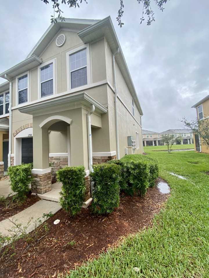 Verano is a fabulous gated community of townhomes located in the much-desired Bartram Park. This 3-bedroom, 2.5-bathroom townhome presents a spacious living room, updated kitchen, and dining area, all with ceramic tile. Kitchen features black appliances, an abundance of 42'' cabinetry, and great quartz countertop space with a built-in sink. This home also has a living/dining combo area with a screened lanai overlooking the peaceful lake. On the second floor, we have the perfect spacious owners' suite with a private bath, double vanity, linen closet, and second and third bedrooms share the additional 2.5 bathrooms, which allows for comfortable, private spaces. Townhome is a desirable End unit. Washer/dryer included and single-car garage. Enjoy the community pool and fitness center. 1st month's rent $1,900 and, a security deposit of $1,900, a $125 Attorney Lease Prep fee, $75 Application fee. The tenant will need to fill out the Verano HOA form and pay the HOA an additional $125.00.