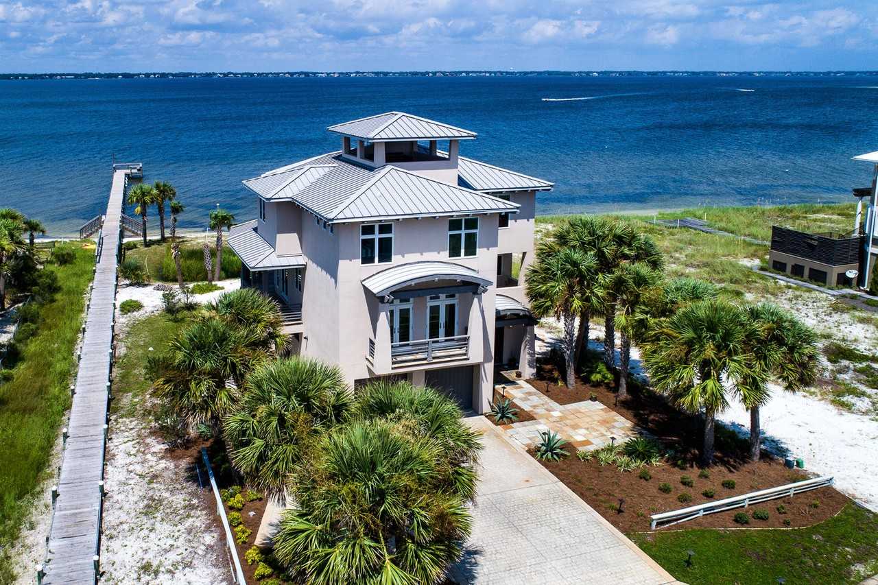 Enjoy life on the Santa Rosa Sound in this stunning waterfront home! This contemporary Pensacola Beach residence was built in 2000 with an extensive remodel in 2015. The recent upgrades include all new Anderson doors and windows. The kitchen could be featured in Coastal Living! The painted custom cabinetry with stylish hardware provides plenty of storage. Gather around the grand island with plenty of bar seating. The appliance package includes a Thermador six burner gas cooktop with stainless hood. The wine cooler, free standing ice maker and walk-in pantry are sure to please the family chef. Perfect for entertaining, the kitchen opens to the breakfast and two living areas. The master suite offers panoramic water views. This remodel highlights a free-standing tub surrounded by custom stone work. The beautiful vanities boast rich gray cabinetry. The spacious master closet features custom built-ins. A unique and practical concept - the laundry room features two front-loading washers and dryers. You will spend much of your time outdoors where there is plenty of deck space to enjoy the Florida sunshine and waterviews. Make your way to the crow's nest to relax in the custom porch swing with views of the Gulf of Mexico. Outdoor amenities include a fireplace on the exterior balcony, a private outdoor shower and easy access to the community pier. With five bedrooms and a study, there is plenty of room for everyone.