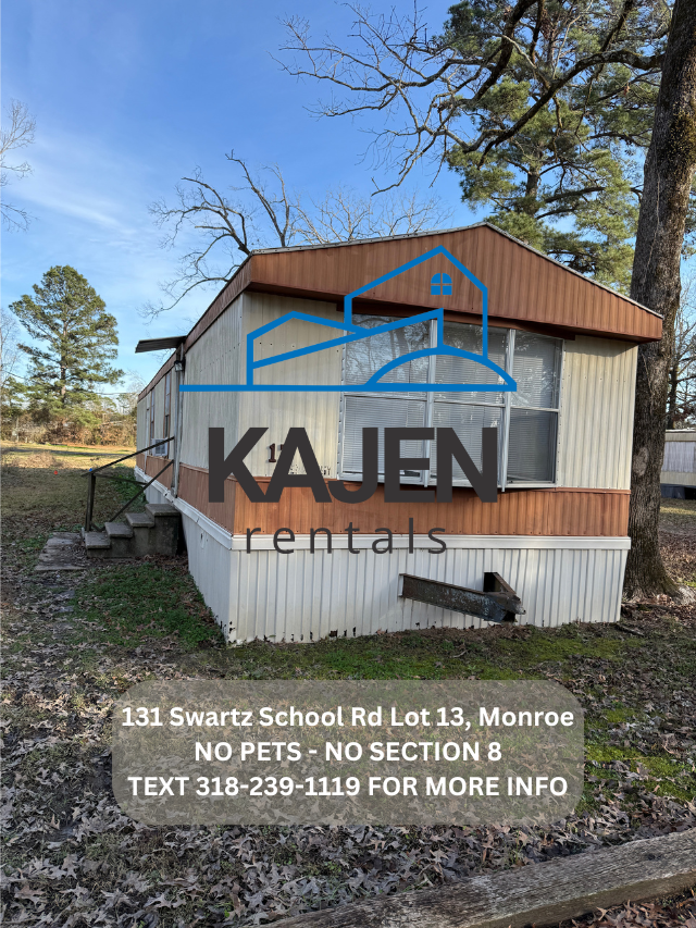 -Text (318) 239-1119 "viewing instructions 131 Swartz School Rd Lot 13" We will then send you the instructions to do a self showing. - -No Pets -No rent to own -No smoking inside -Rent is $450.00 -Deposit is $360.00 -Income will be verified on each applicant. -Central Heat and Window Unit AC. -Located at 131 Swartz School Rd Lot 13 Monroe LA 71203 -Includes stove. -2 bedroom 1 bath home. -You pay utilities (water, electric, mowing) -Trash is included (dumpster located in Mobile home park) -Washer and Dryer connections. -Home is all electric. -$50 application fee per adult.