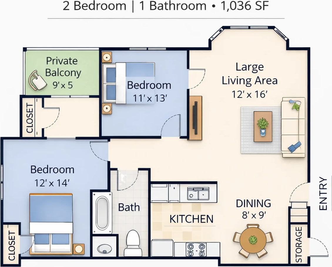 Introducing the 2 Bed 1 Bath Silver Floor Plan located in Greenville. With 1036 sq ft of thoughtfully crafted space, this layout provides a modern design for convenient living. Enjoy a lifestyle of unmatched comfort with amenities that cater to your needs. Contact us today to schedule your tour of this exceptional floor plan.